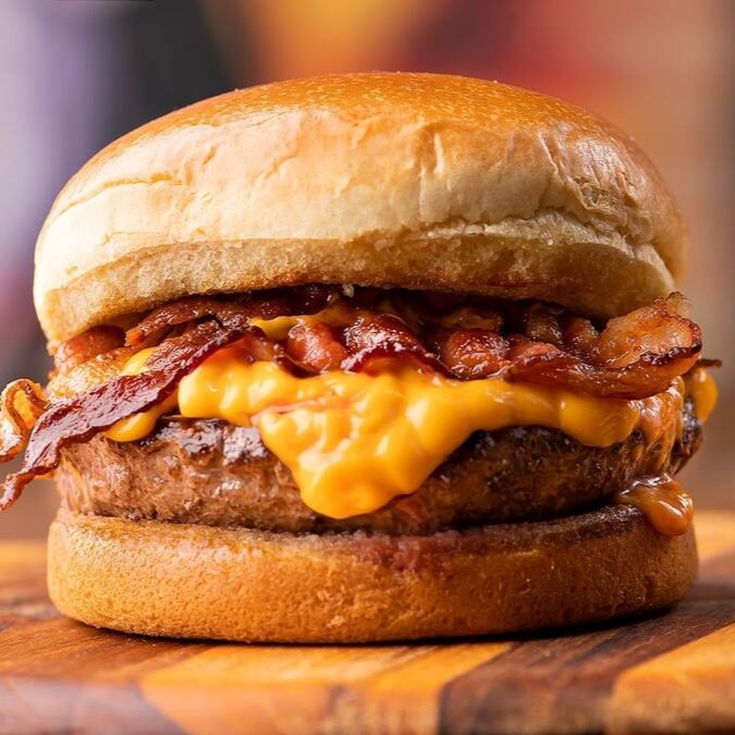 Pão de brioche, hambúrguer artesanal 160g, cheddar e bacon