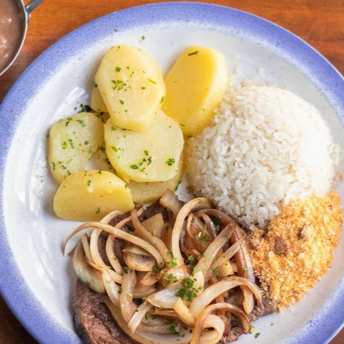 Acompanha arroz, feijão, batata sauté e farofa.