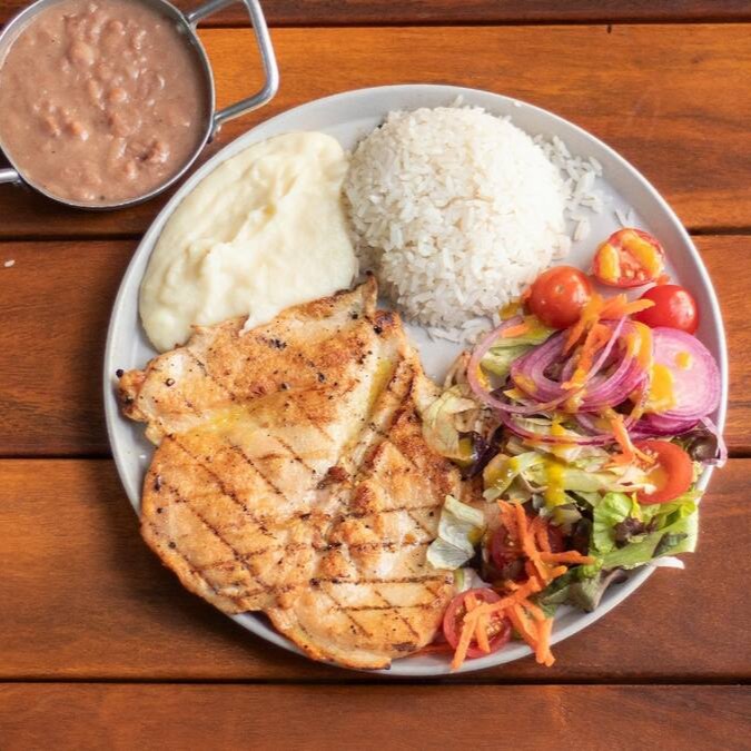 Acompanha arroz, feijão, purê de batatas e saladinha.