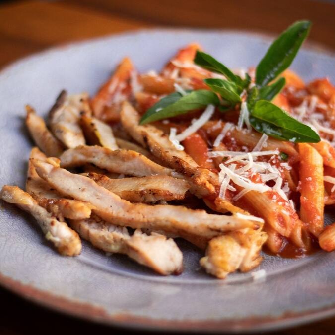 Tirinhas de Frango Grelhado - Acompanha penne ao molho sugo.