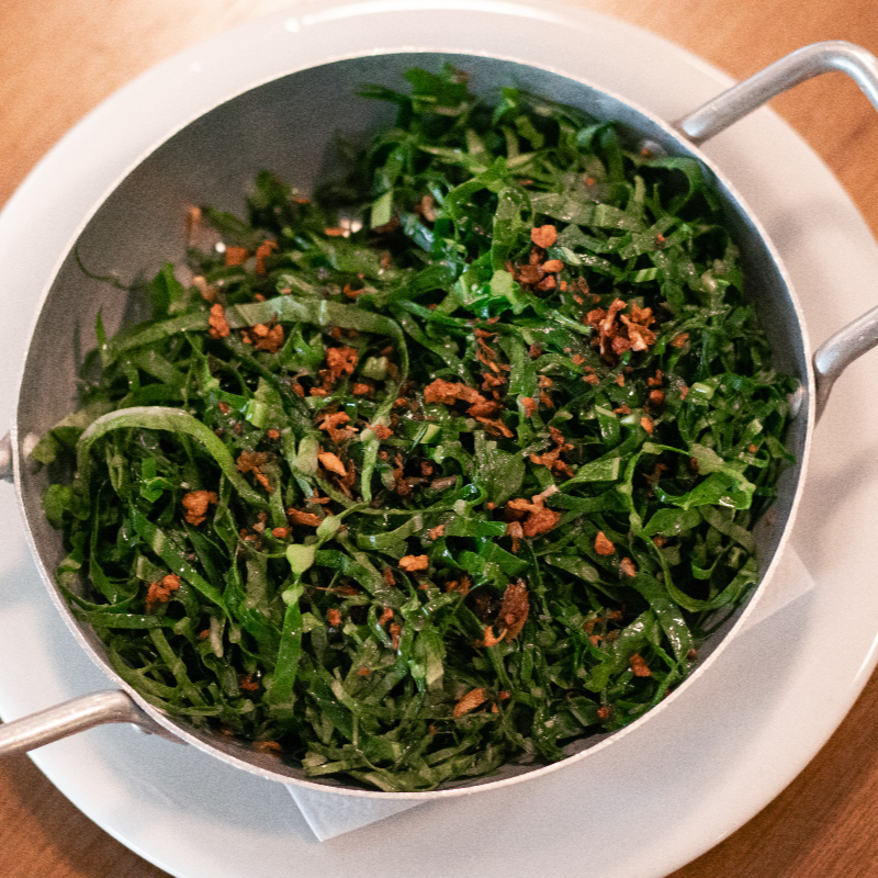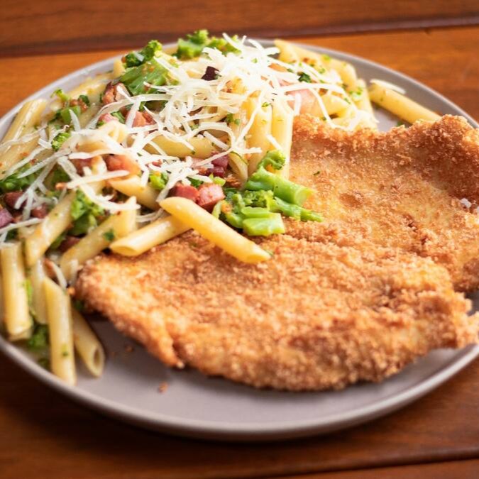Acompanha penne ao alho com brócolis e bacon.