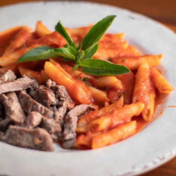 Tirinhas de Filé Mignon Grelhado - Acompanha penne ao molho sugo.