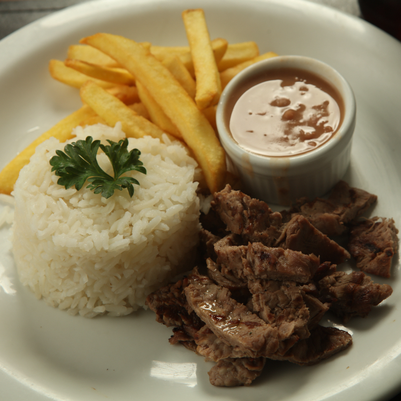 Tirinhas de Filé Mignon Grelhado - Acompanha arroz, feijão e fritas.