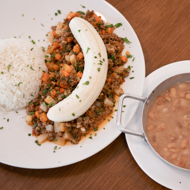Acompanha arroz, feijão e banana.