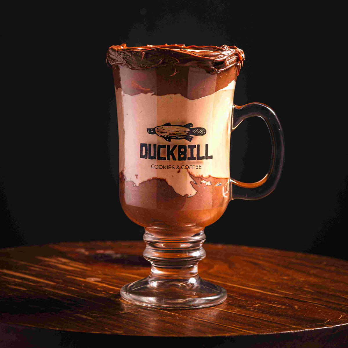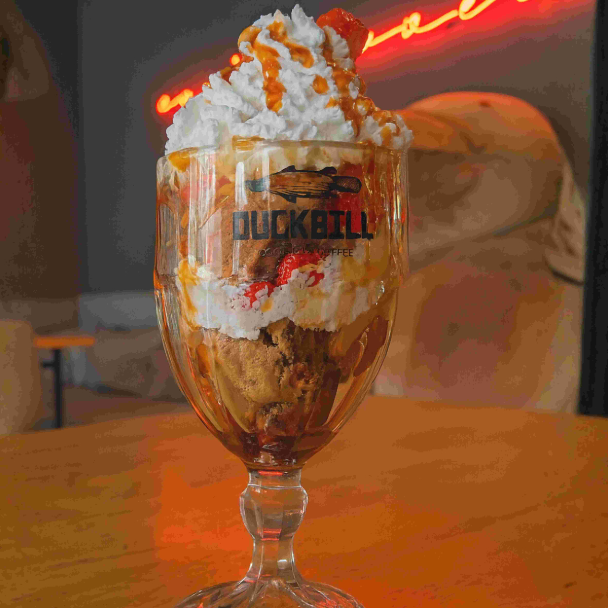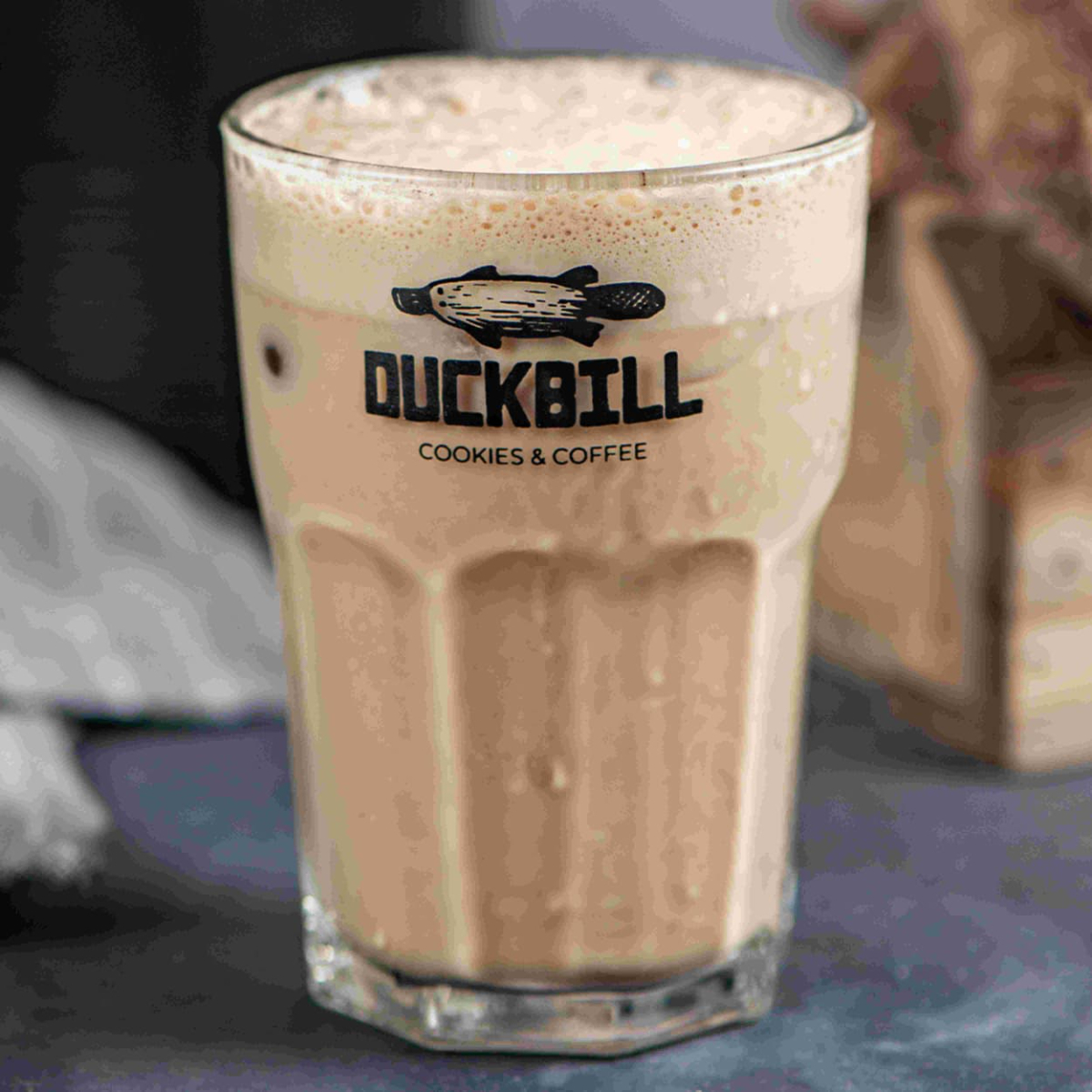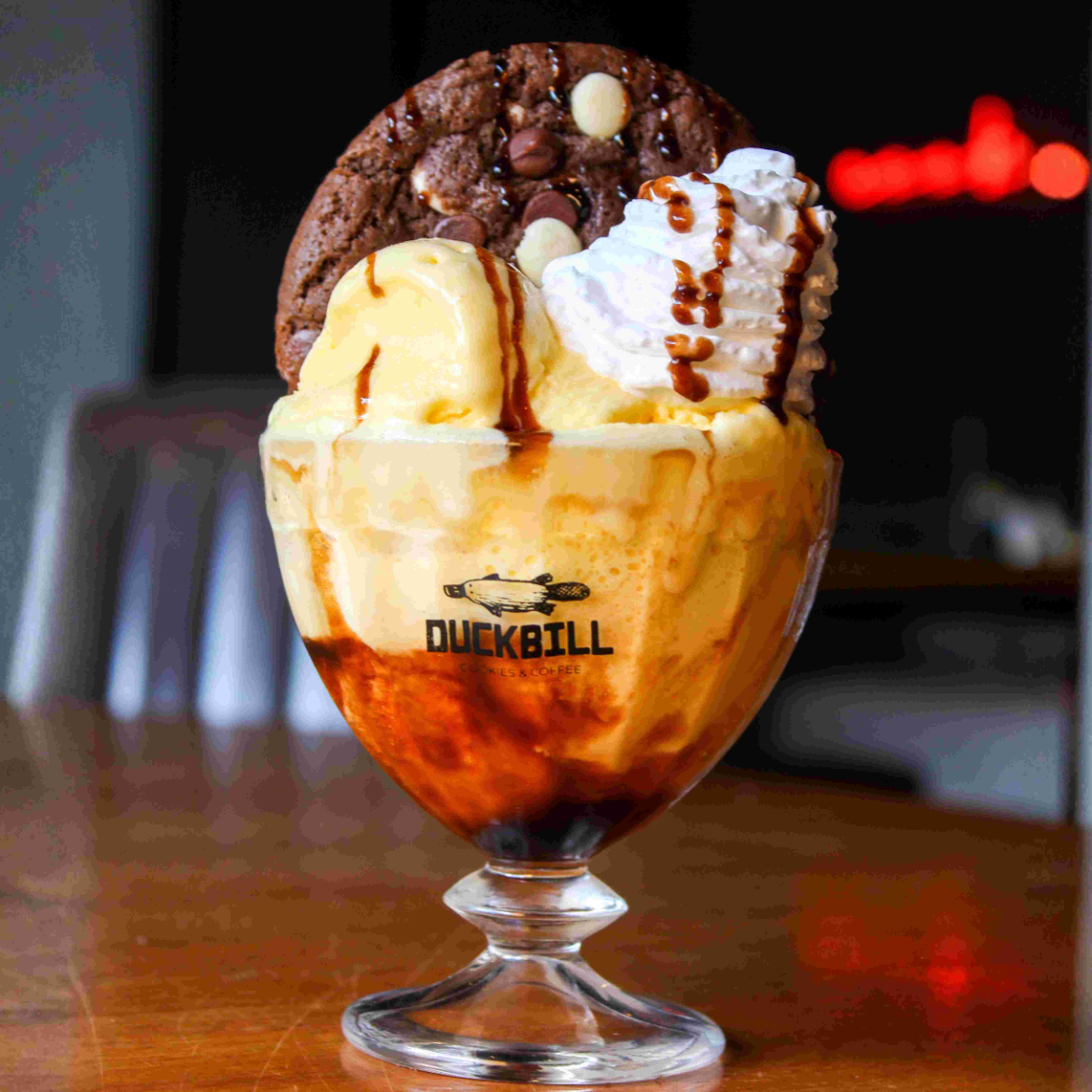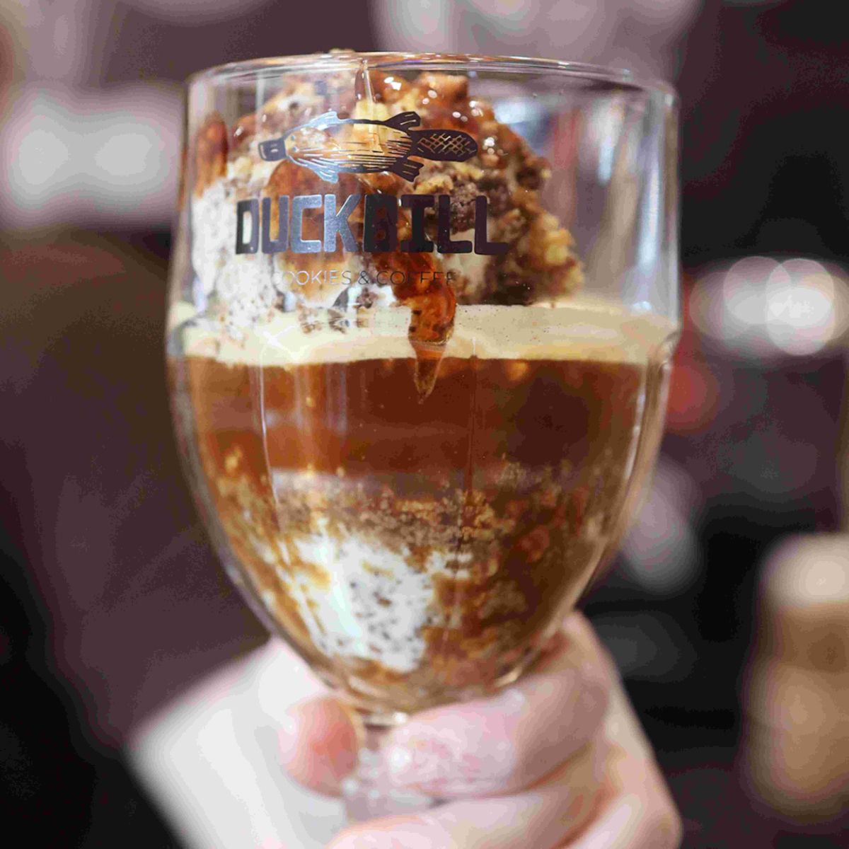 Sorvete empanado com farofa de cookie Duckbill e finalizado com calda de caramelo e delicioso espresso especial Duckbill.