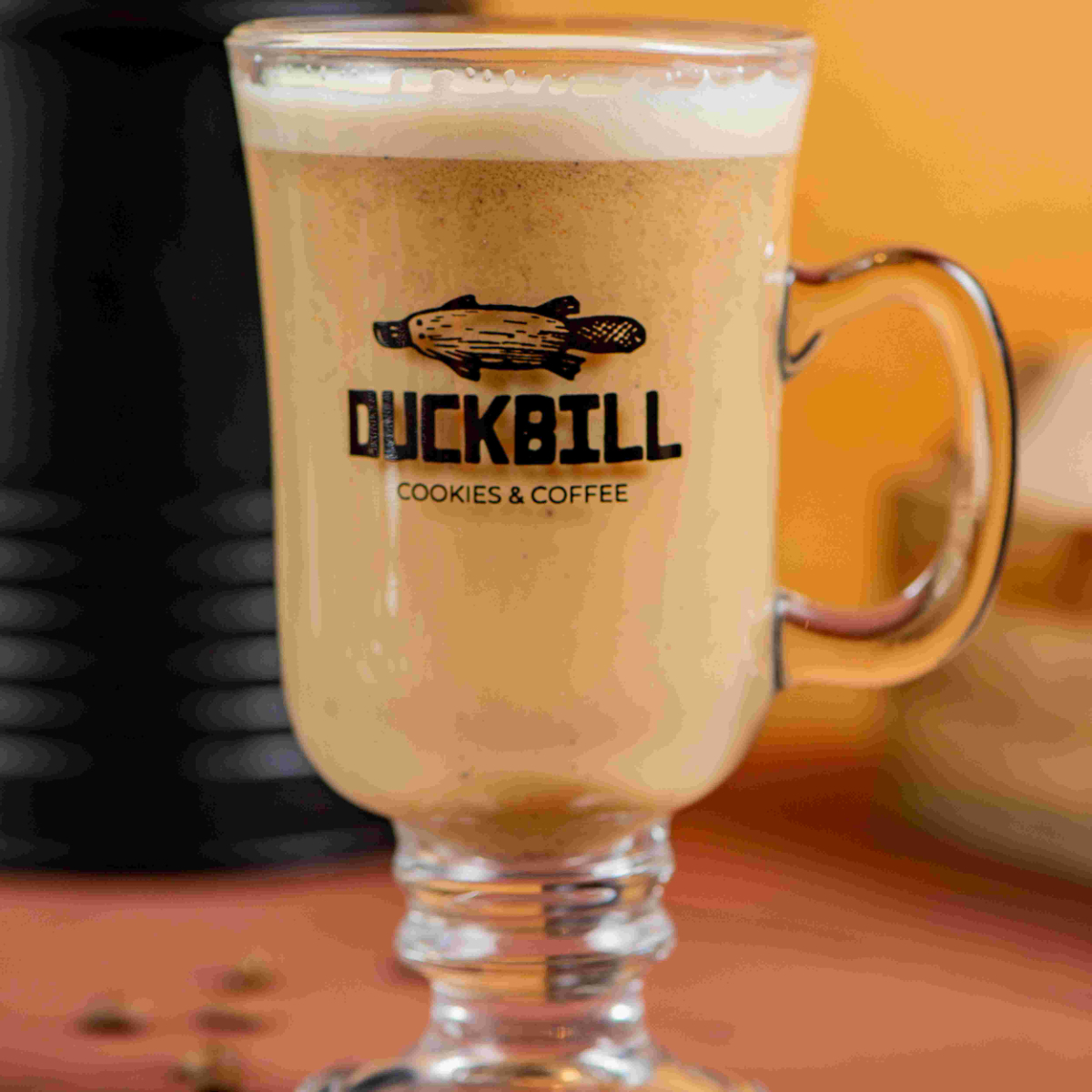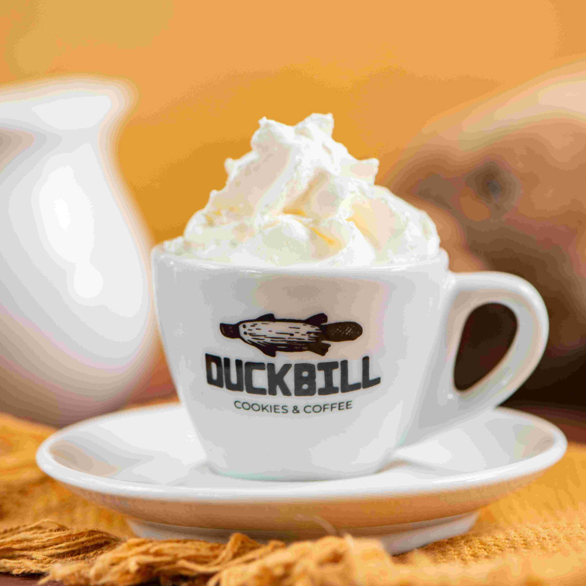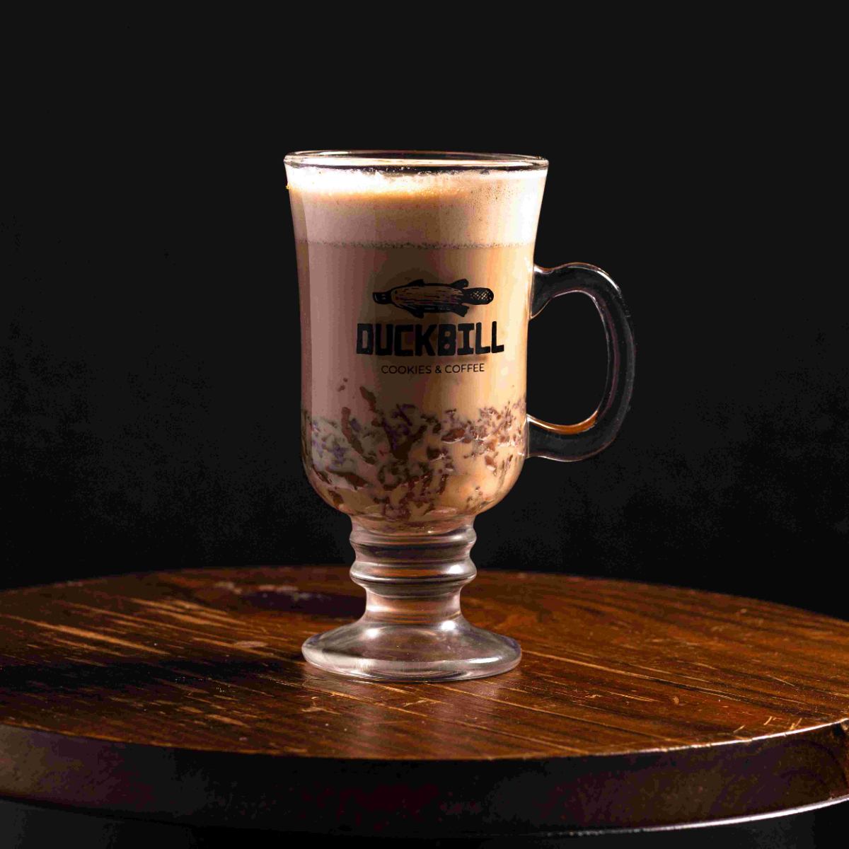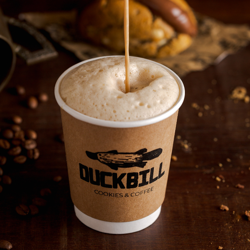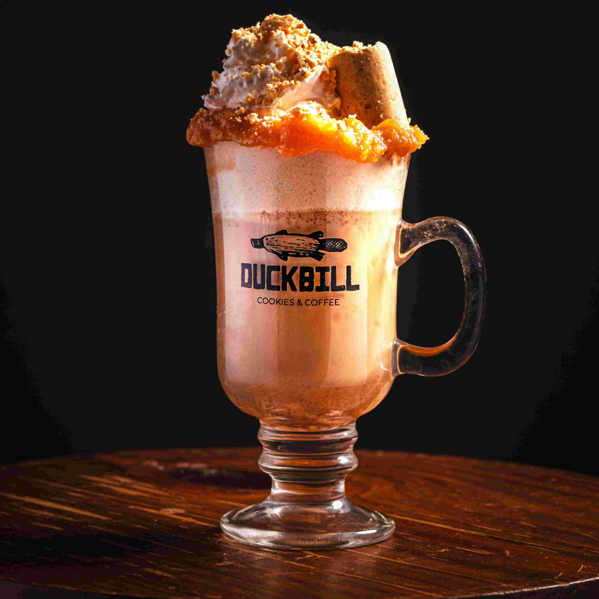 Sorvete empanado com farofa de cookie Duckbill e finalizado com calda de caramelo e delicioso espresso especial Duckbill.