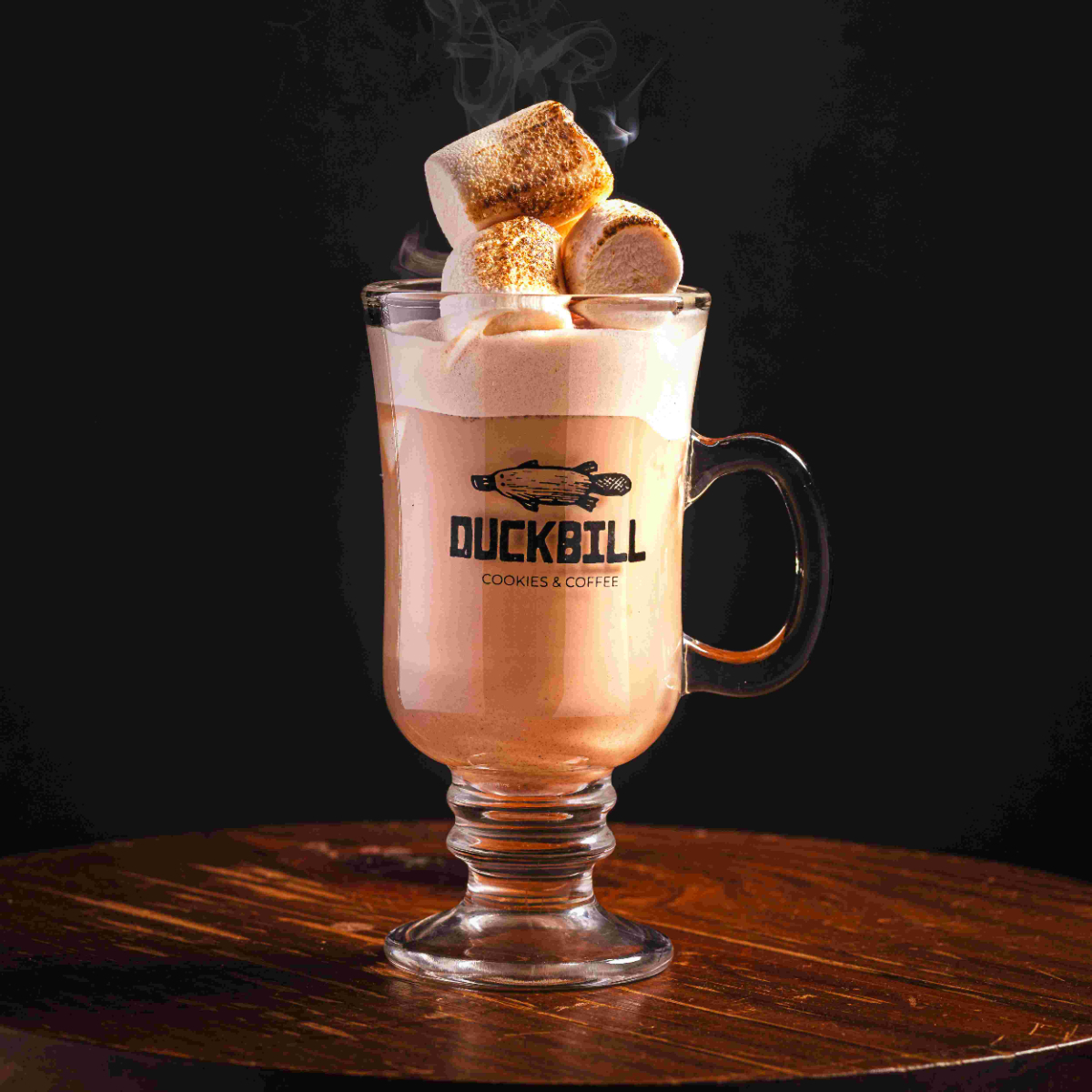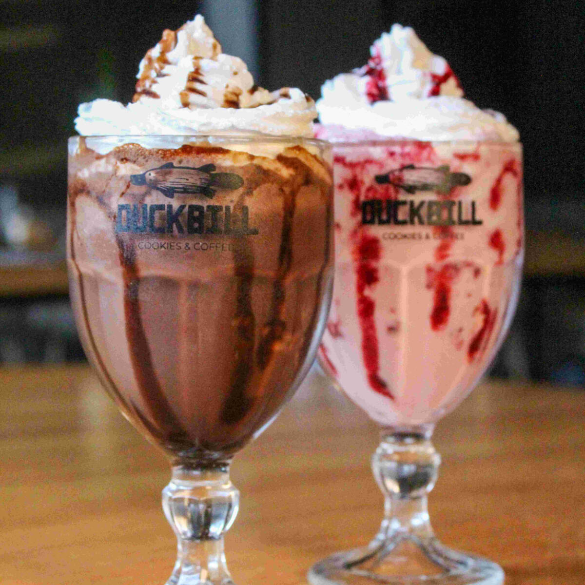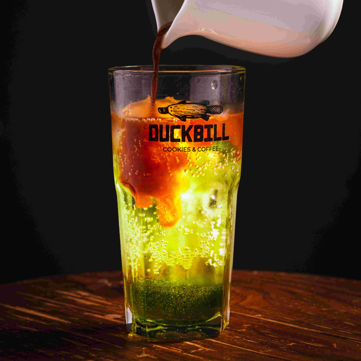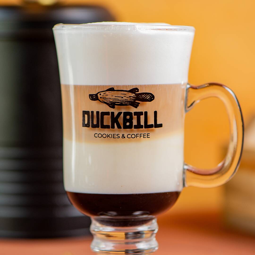 Sorvete empanado com farofa de cookie Duckbill e finalizado com calda de caramelo e delicioso espresso especial Duckbill.