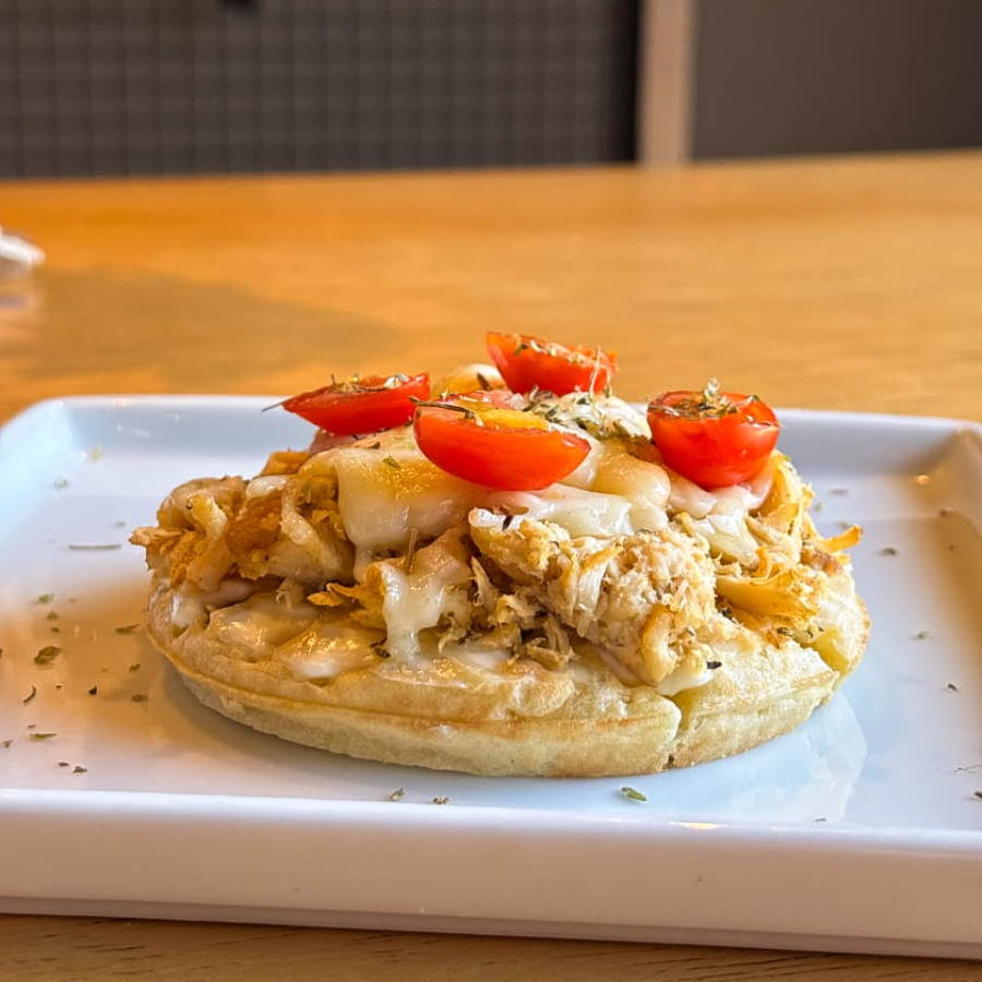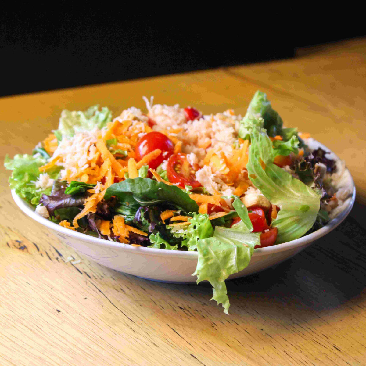 Mix de alface, rúcula, tomate cereja, cenoura, croutons, frango desfiado e com um molho Caesar.