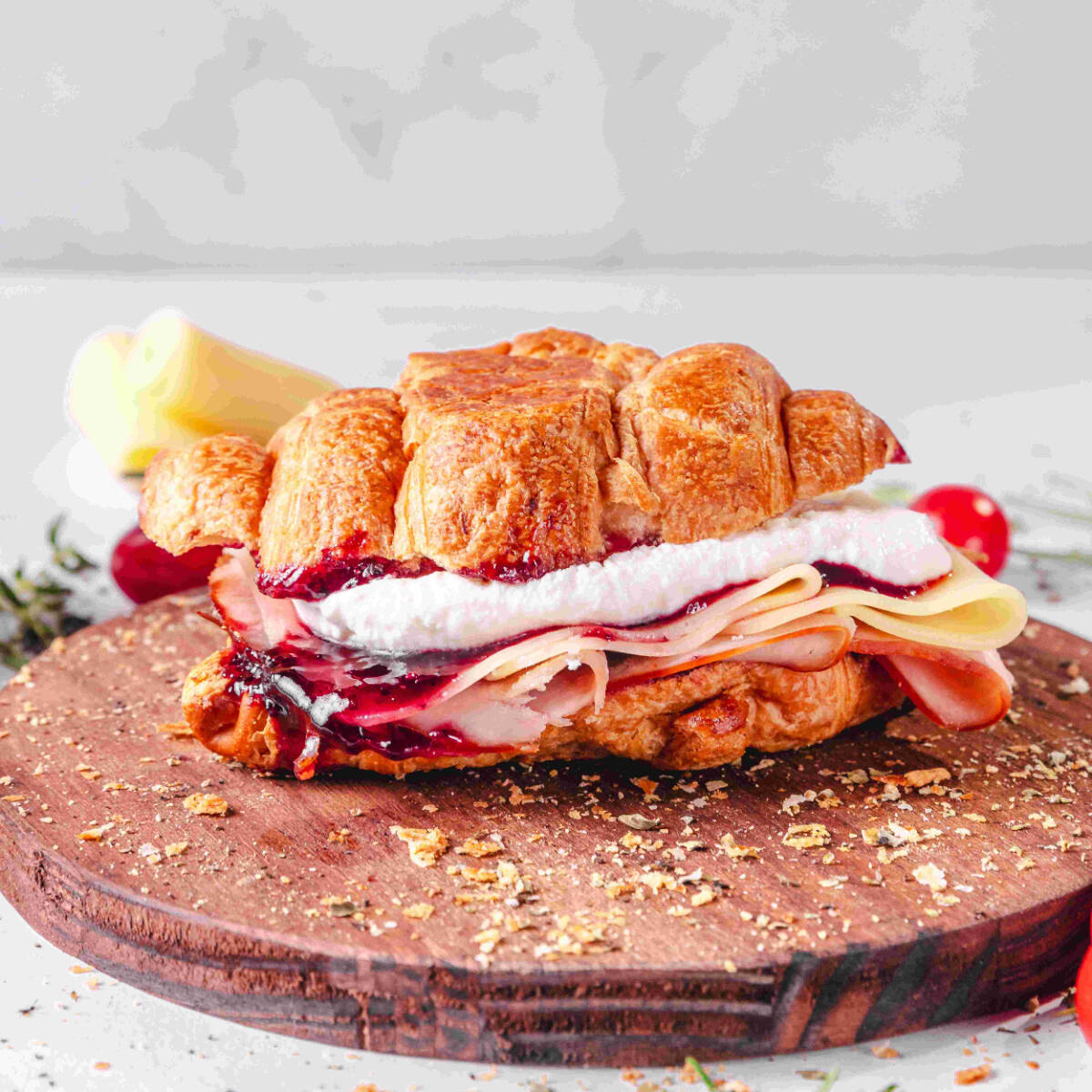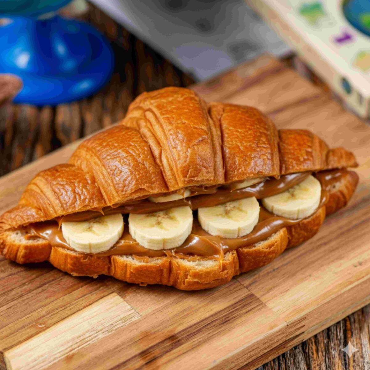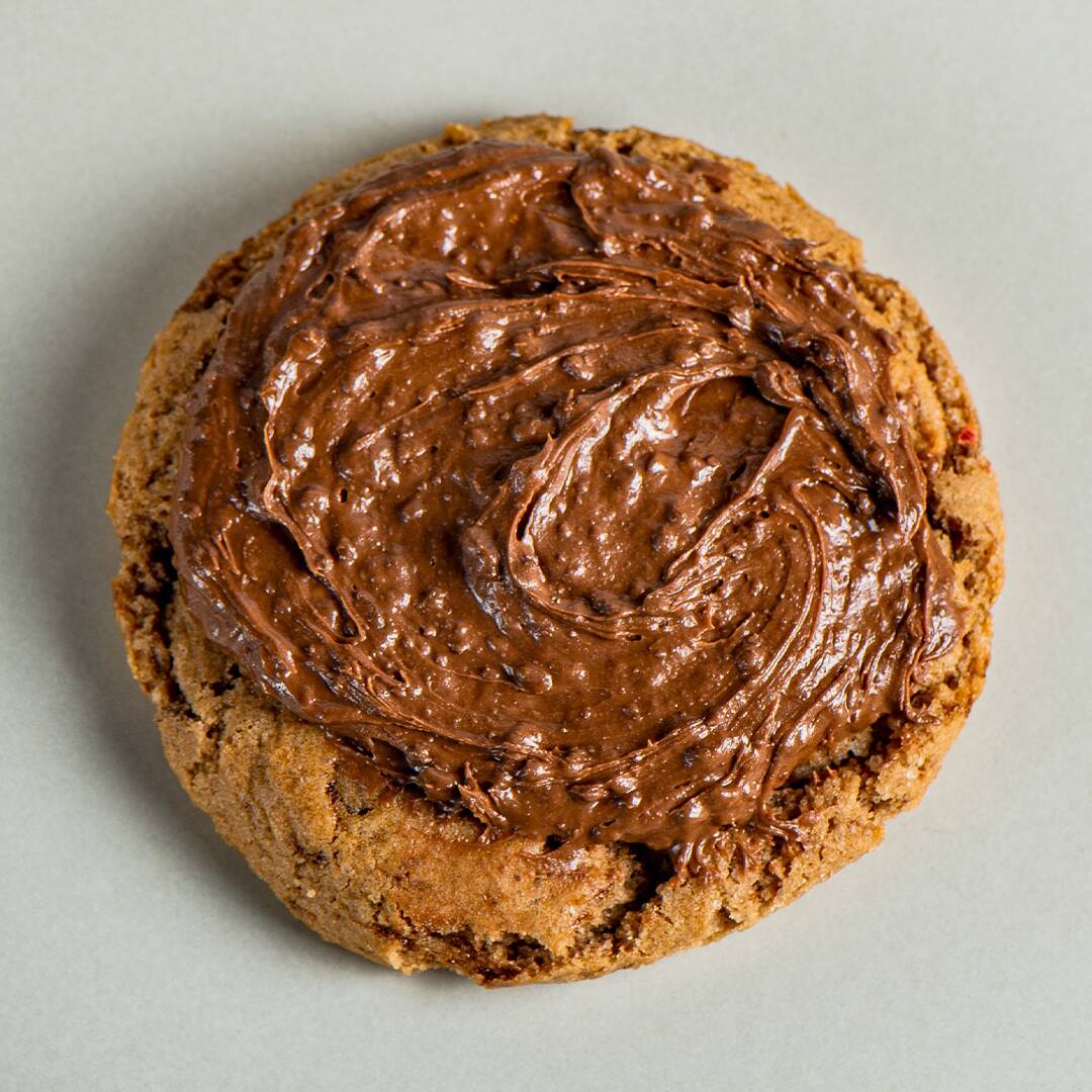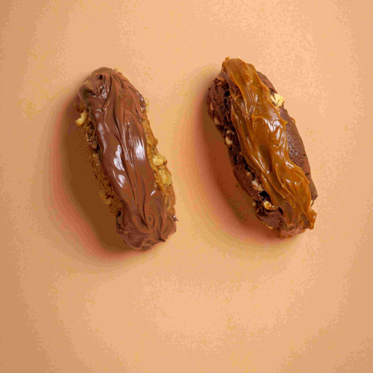 Um cookie cortado ao meio, recheado com doce de leite, Nutella® ou Ovomaltine®