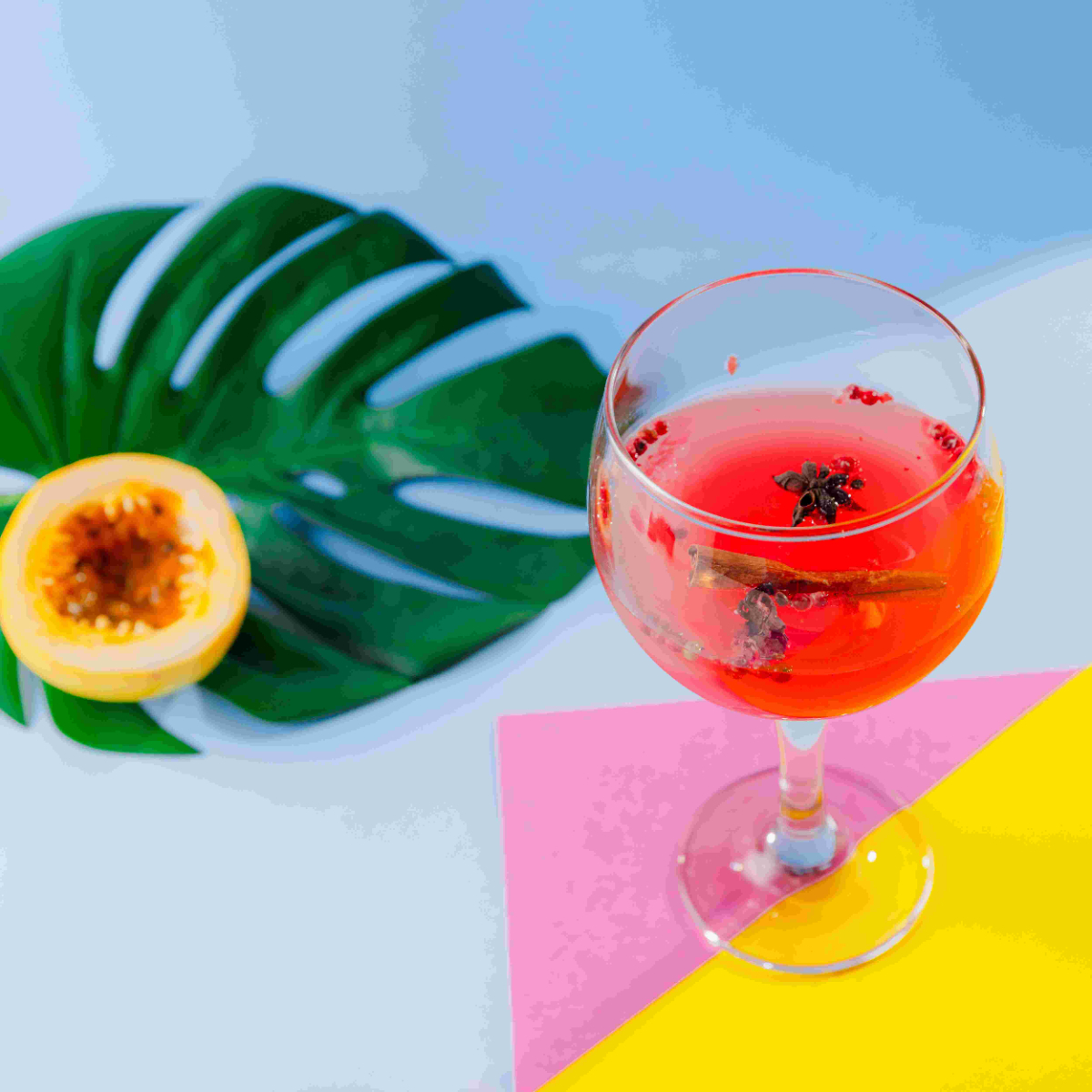 Água tônica com essência e espresso (Sabores: Limão siciliano | Maçã verde Maracujá vermelho | Morango).