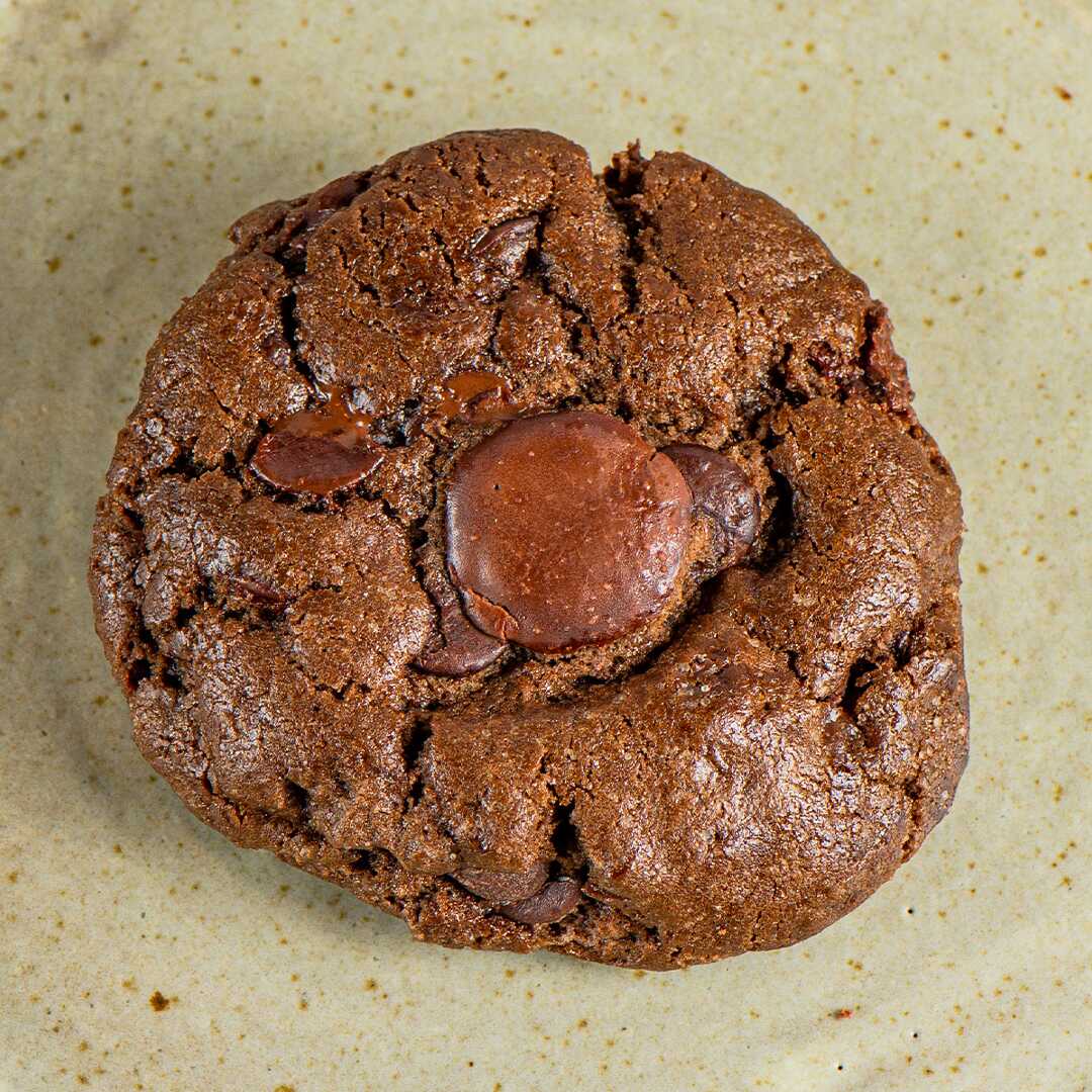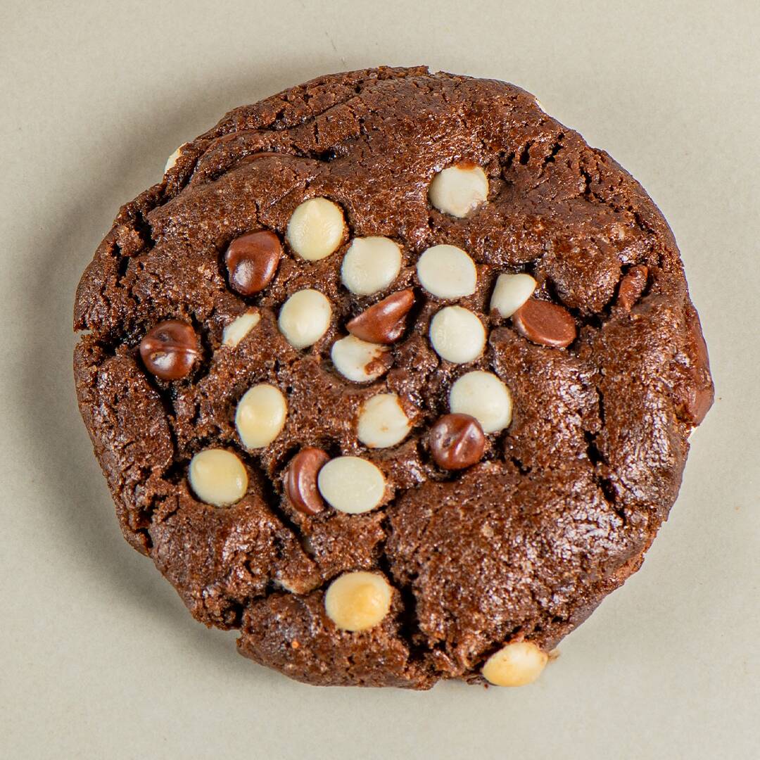 Massa black de cacau 100% com gotas de chocolate branco e chocolate ao leite.
