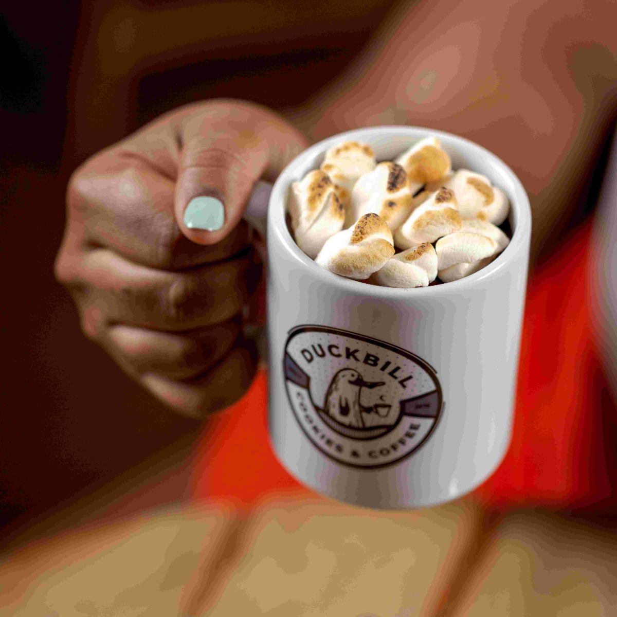 Um Chocolate Quente Cremoso elaboração com cacau levemente adoçado, finalizado com marshmallow. Tamanho de 240ml.