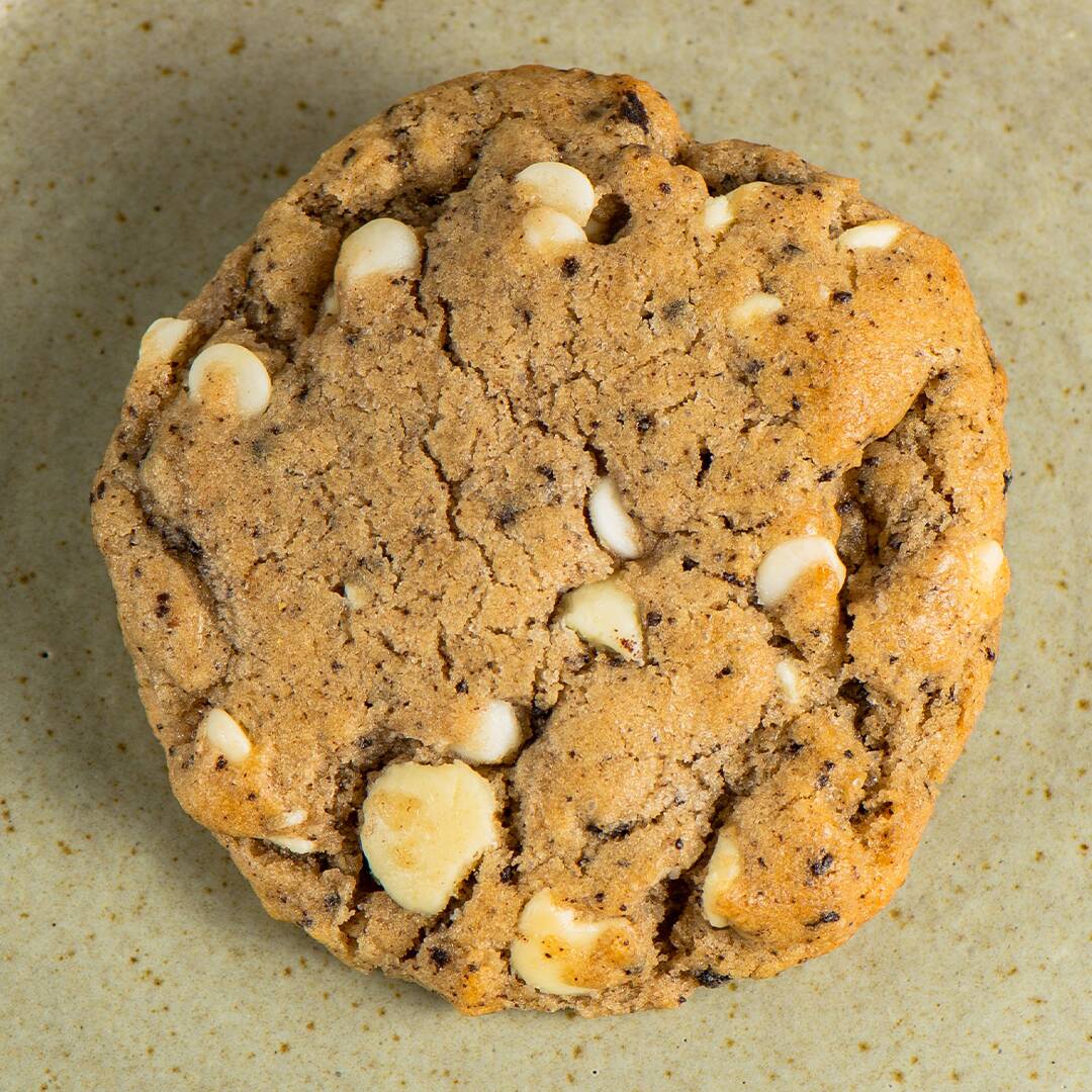 Massa branca com leite em pó, gotas de chocolate branco e pedacinhos de biscoito.