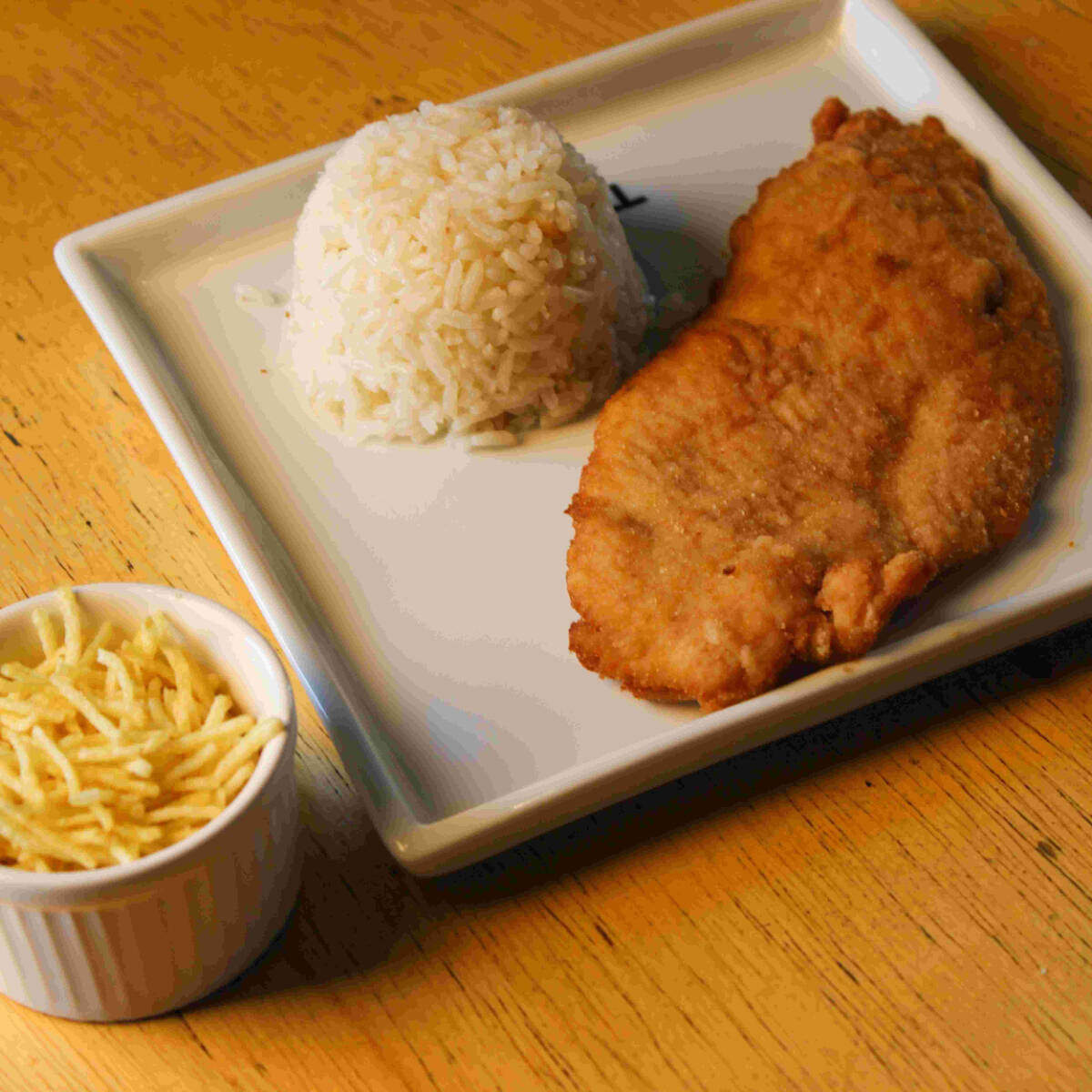 Frango ou Carne à milanesa, acompanha arroz e batata palha. Por favor, informe na observação se deseja Carne ou frango.