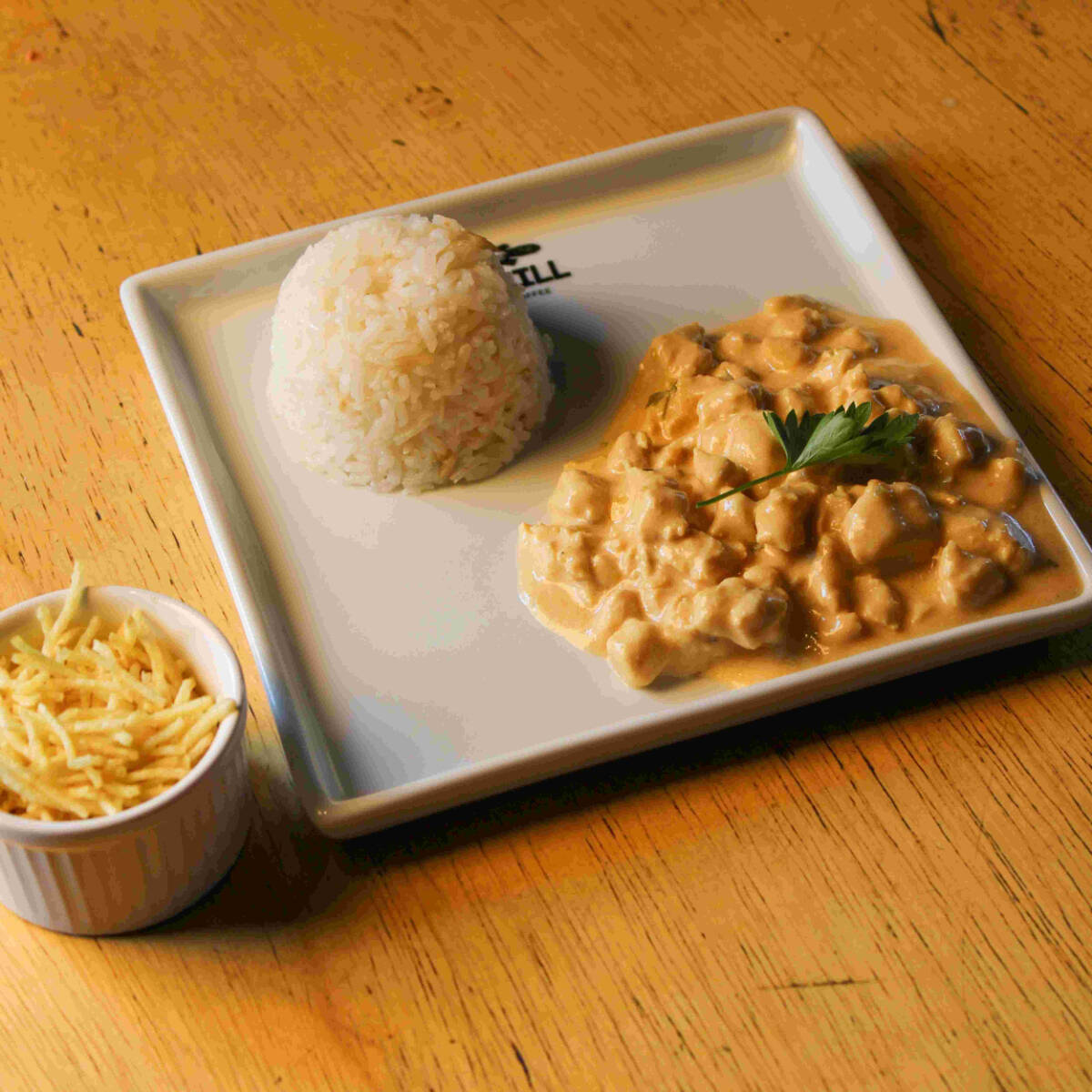 Strogonoff de frango acompanhado de arroz branco e batata palha.
