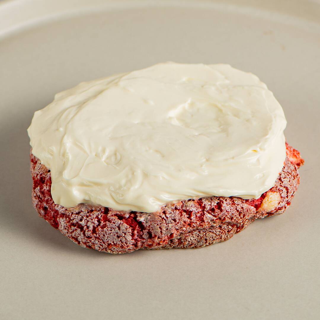 Massa vermelha com chocolate branco e coberto com cream cheese.