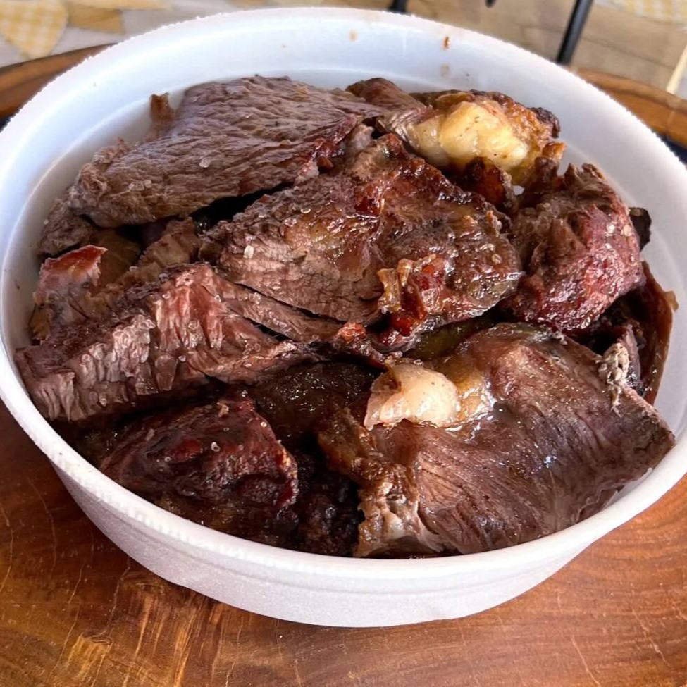 Uma marmita irresistível com bife de pernil acebolado, macio e bem temperado, acompanhado de arroz soltinho, feijão saboroso, mandioca frita crocante por fora e macia por dentro, além de uma porção fresca de salada. Uma refeição completa, caseira e cheia de sabor para o seu Dia a Dia.