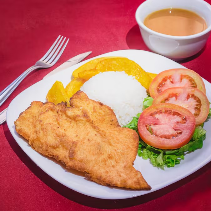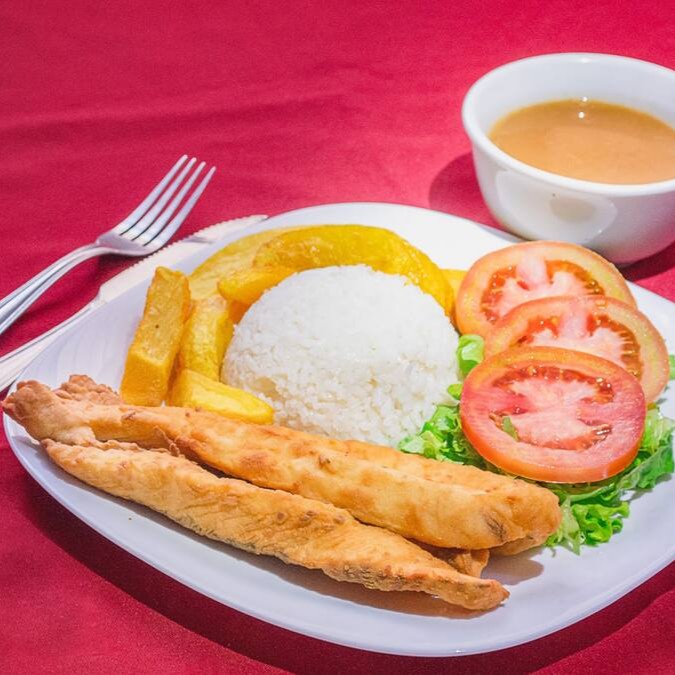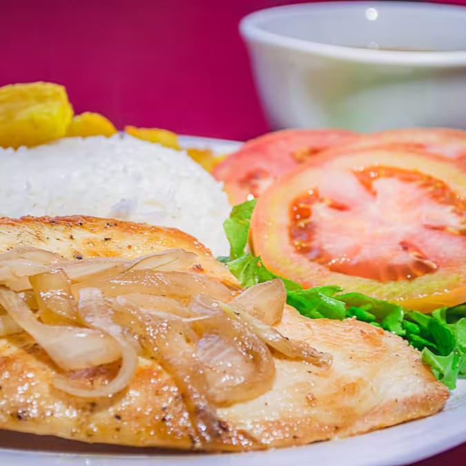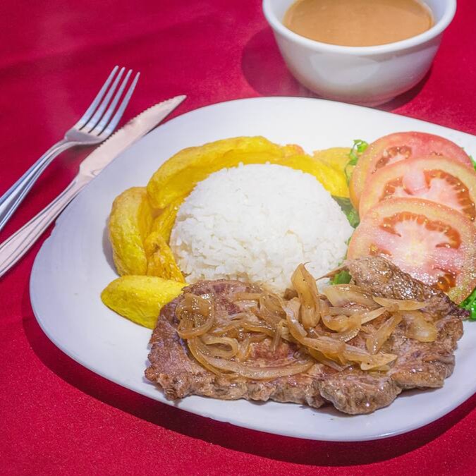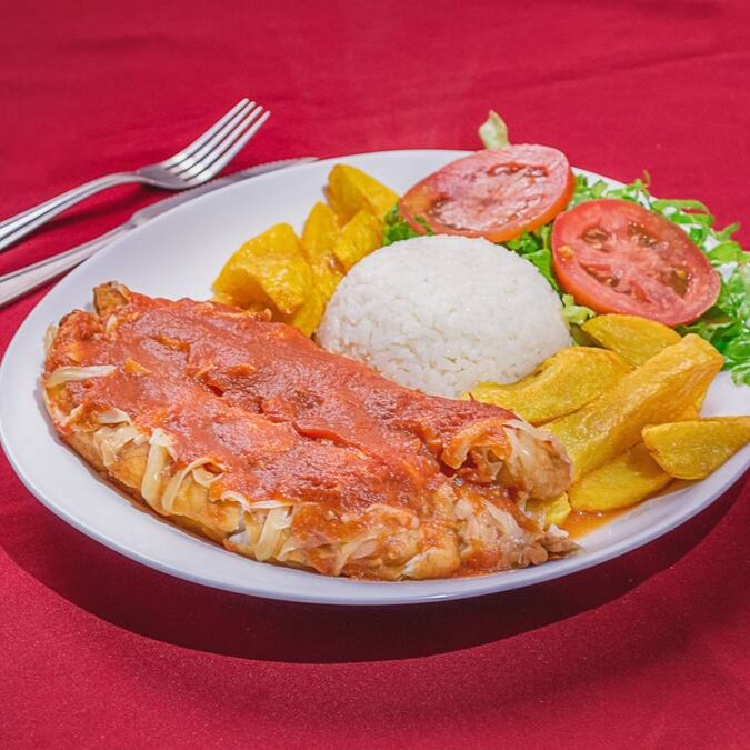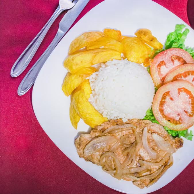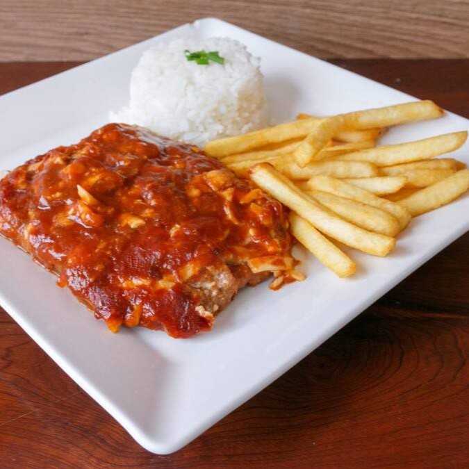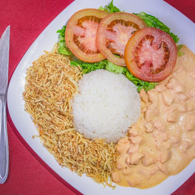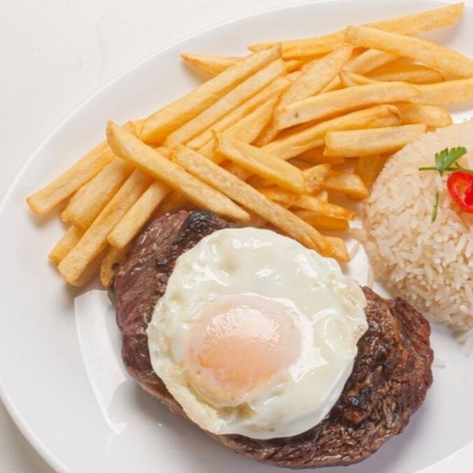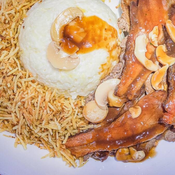 Filé grelhado ao molho de madeira, bacon, arroz cremoso, champignon, fritas