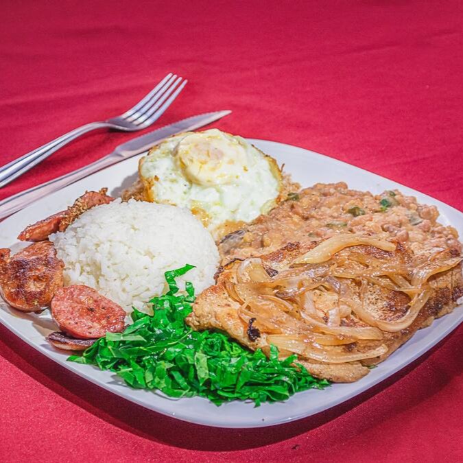 Arroz, tutu de feijão, Lombo Grelhado, linguiça, couve e ovo frito