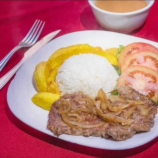 Arroz, contra filé, ovo e fritas.