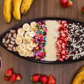 Açai completo que acompanha Leite em pó, mousse, banana, sucrilhos, chantilly, morango, cobertura e granola