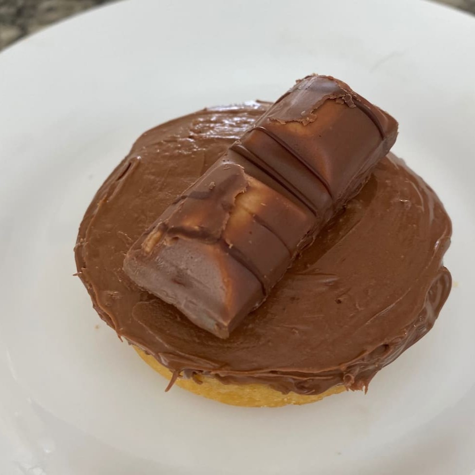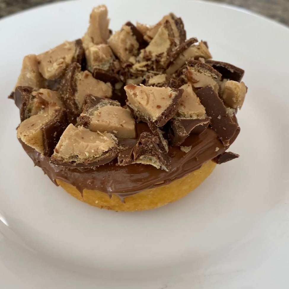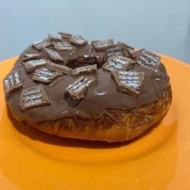 Delicioso donut artesanal, sem recheio, com cobertura de chocolate ao leite com Kit Kat.