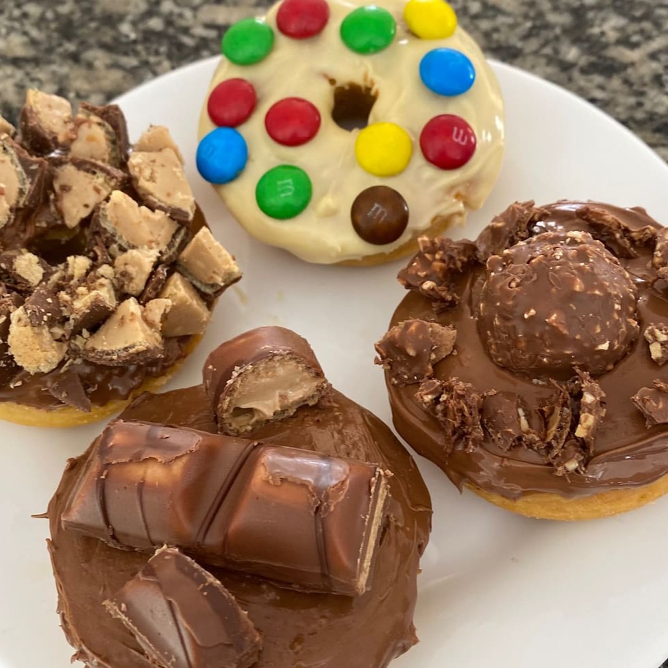 4 deliciosos donuts caseiros nos sabores de ferrero rocher, Kinder bueno, Sonho de Valsa e chocolate branco com M&Ms