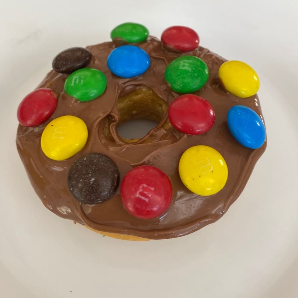 Delicioso donuts caseiro coberto com chocolate ao leite e confeitos m&ms coloridos