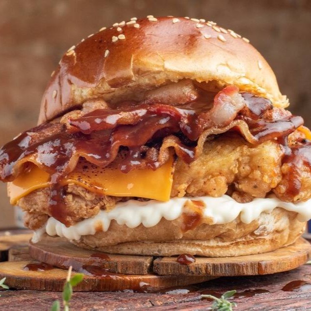 Irresistível filezinho Fika Frito, fatias de queijo cheddar, bacon, molho barbecue e maionese especial no pão tostado na manteiga.