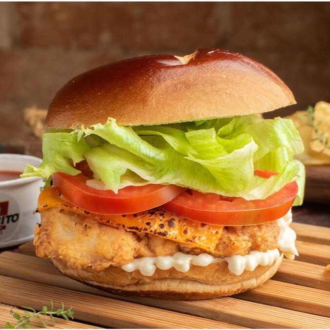 Filezinho Fifa Frito, crocante por fora e macio por dentro, aquela famosa maionese especial, fatias de queijo cheddar tostadinhas, alface e tomate.