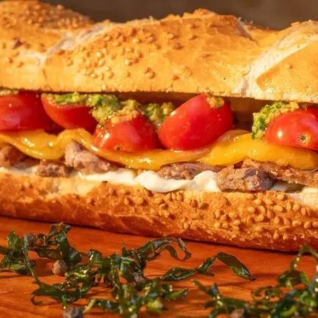 20cm Baguete Italiana, Bife Ancho Grelhado Laminado Coberto Por Uma Pasta De Tomates Cerejas Assados... Uma Explosão De Sabor, Delicioso Queijo Prato Mineiro Uai E Rúculas Frescas