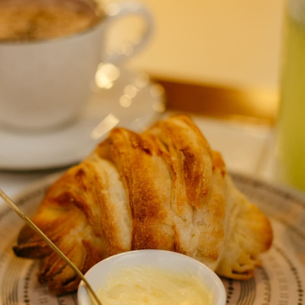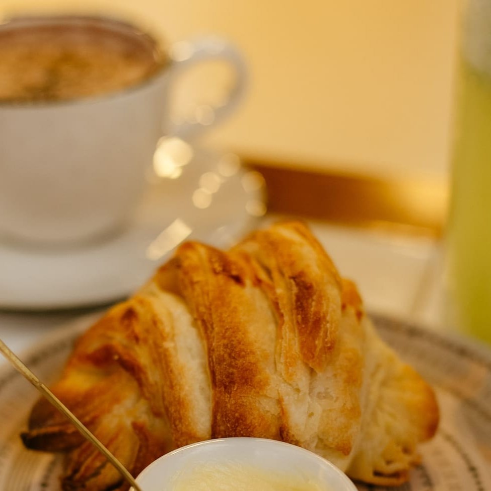 Croissant com manteiga, acompanhado de uma bebida à sua escolha e uma refrescante salada de frutas para completar o seu café!