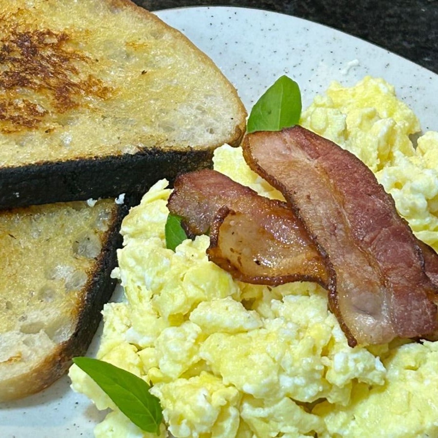 Ovo mexido cremoso com bacon crocante e pão italiano de fermentação natural, acompanhado de uma bebida à sua escolha e uma refrescante salada de frutas para completar o seu café!