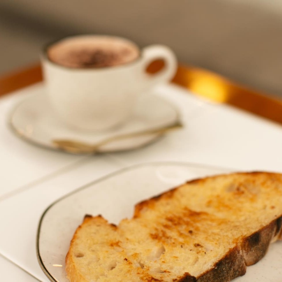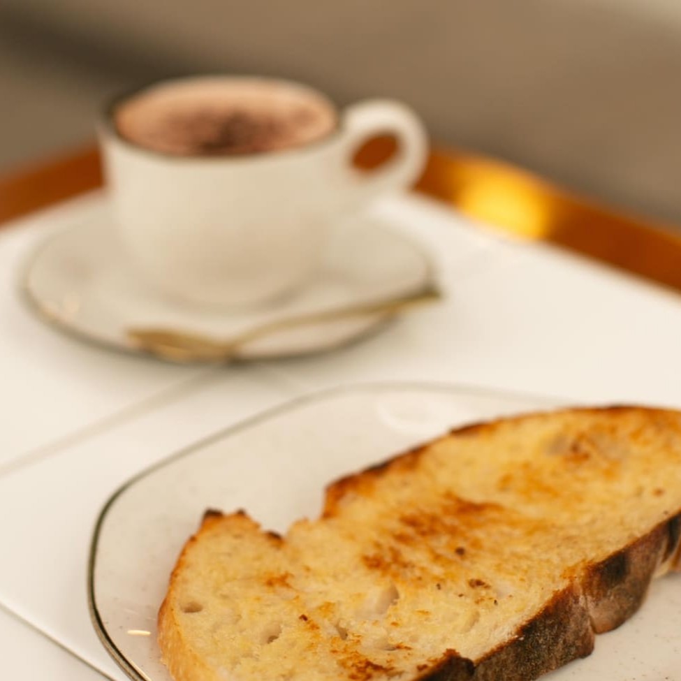 Toast de manteiga feita com pão italiano de fermentação natural, acompanhado de uma bebida à sua escolha e uma refrescante salada de frutas para completar o seu café!