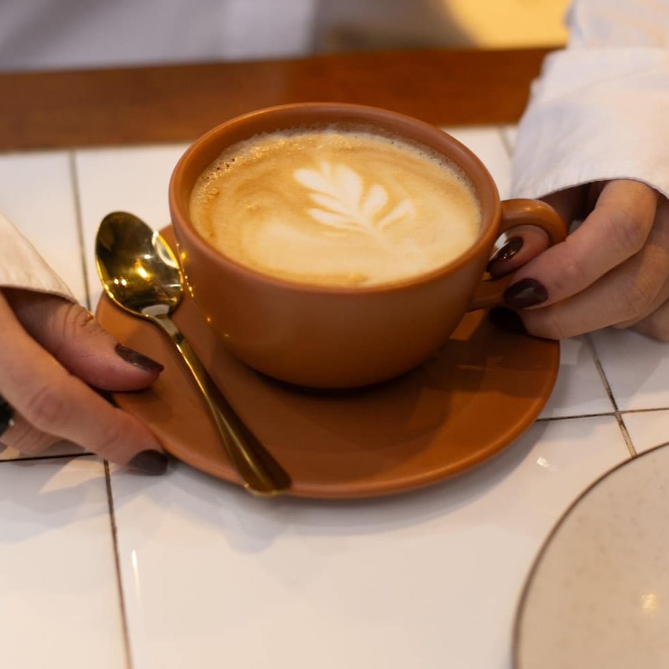 Cappuccino de 200ml preparado com café espresso gourmet, canela, cacau 50% e leite