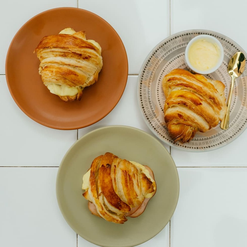 O nosso croissant em forma de meia-lua, feito com massa folhada e manteiga. Tem uma crosta dourada e crocante, e um interior macio. Pode ser servido puro ou recheado com chocolate, queijo, presunto, peito de peru e um delicioso doce de leite.