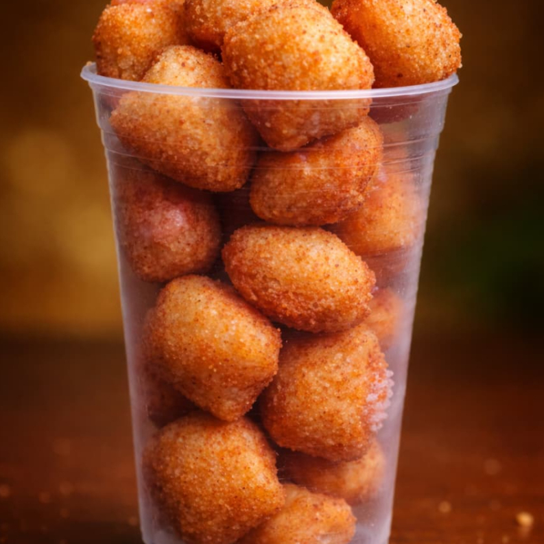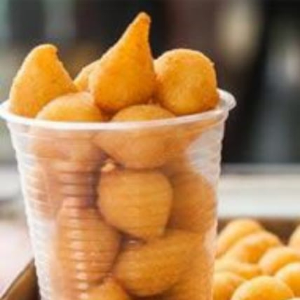deliciosas coxinhas fritas na hora, com sabores a sua escolha: tradicional, frango cm catupiry, presunto e queijo.
