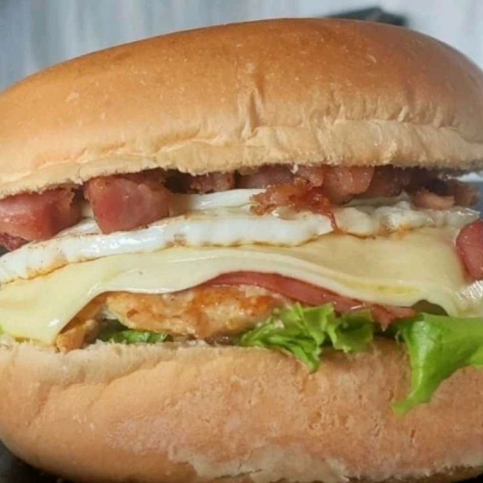 Pão, maionese, hambúrguer de frango 90g, mussarela, presunto, ovo, bacon, alface e tomate