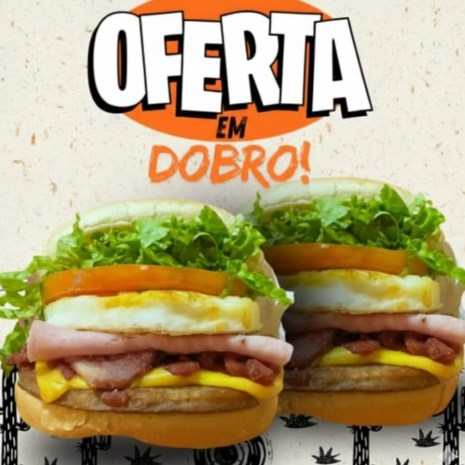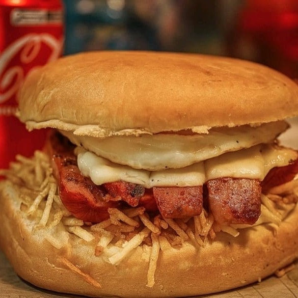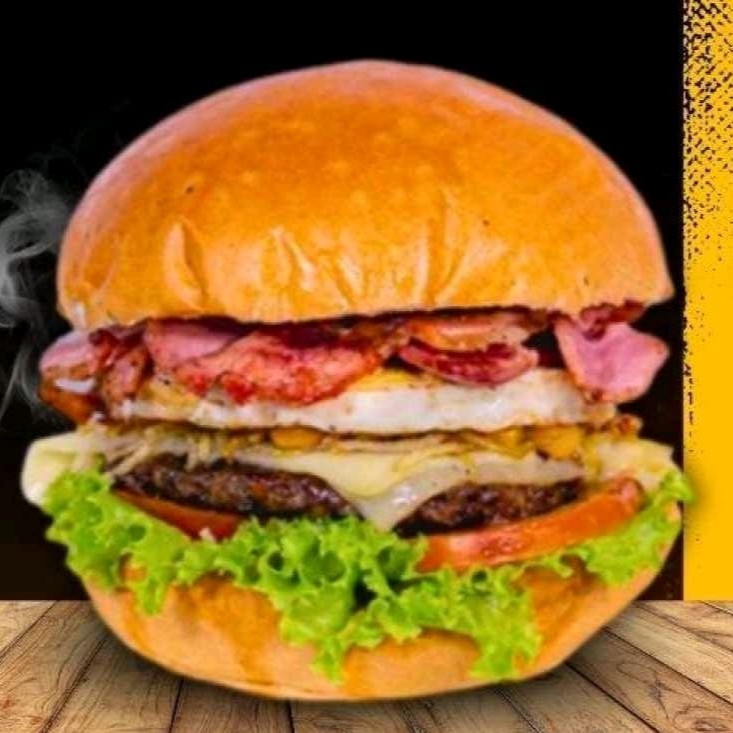 Pão, maionese, 2 hambúrguer 90g, mussarela, presunto 2 ovos, bacon, alface e tomate
