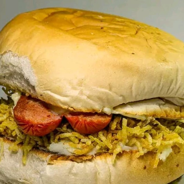 Pão, maionese, 2 salsichas, mussarela, ovo e batata palha