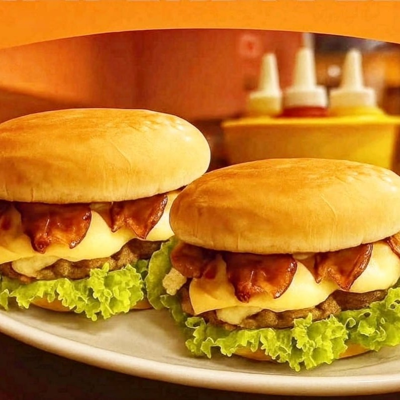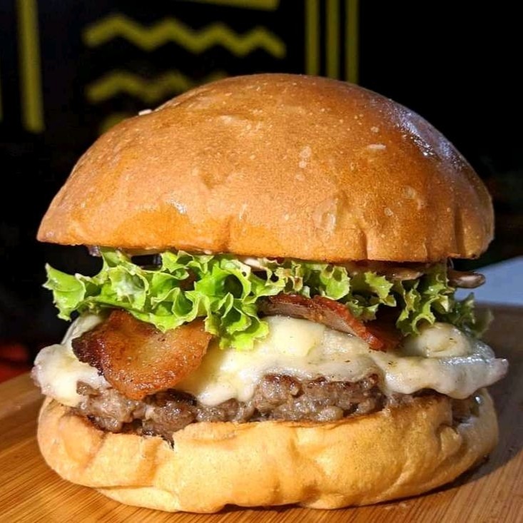 Pão, maionese, hambúrguer 90g, mussarela, bacon, alface e tomate