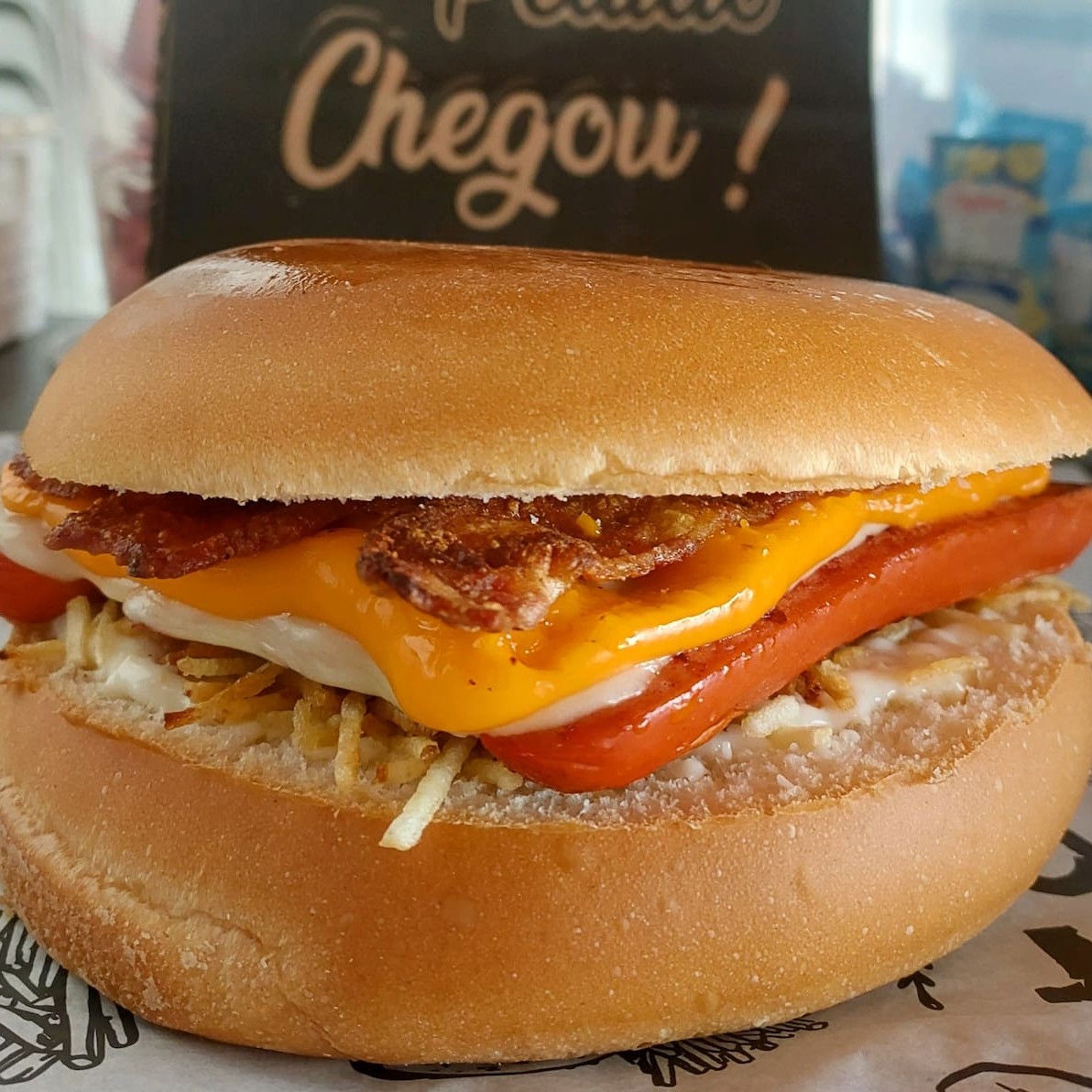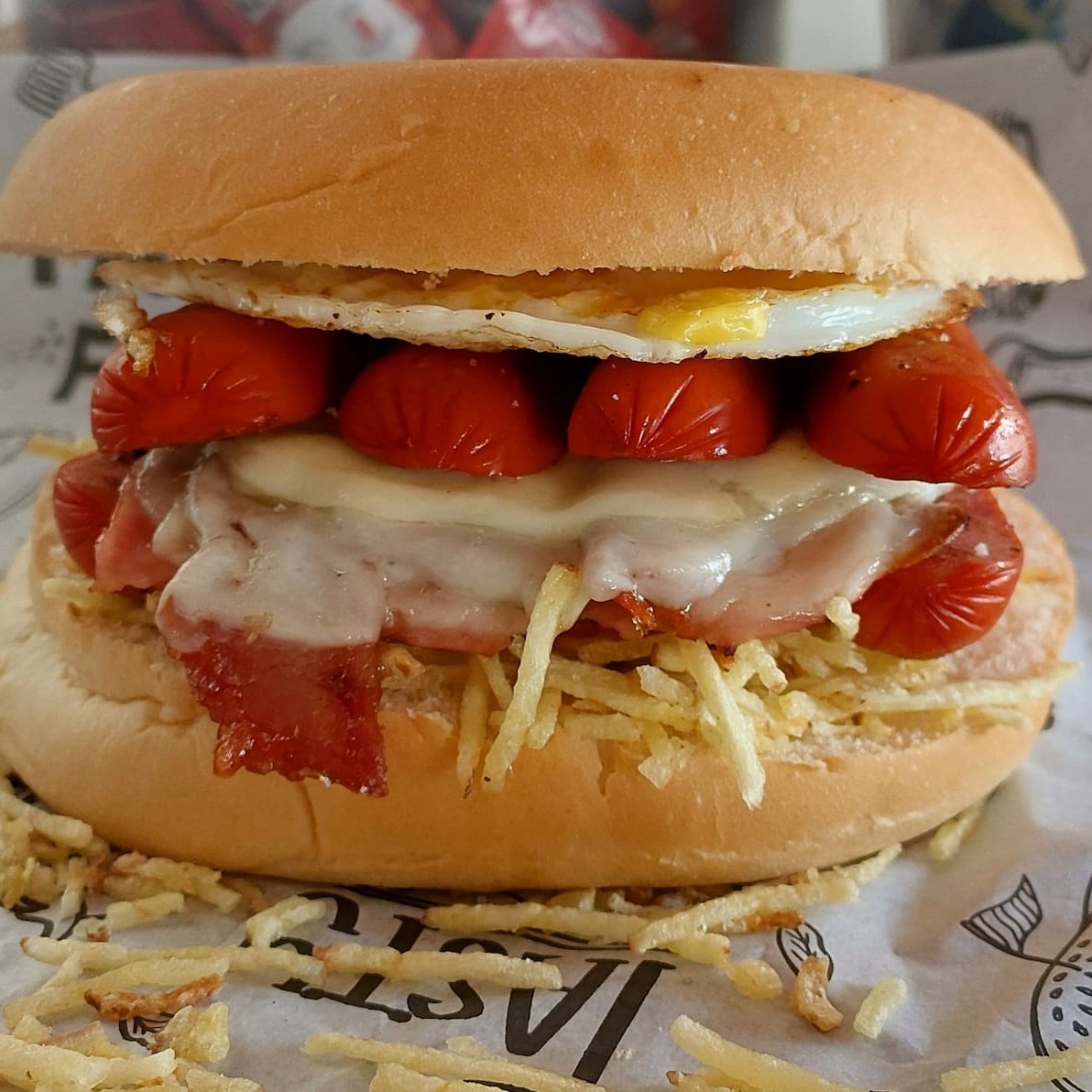 Pão, maionese, 2 salsichas, mussarela, presunto, ovo, bacon e batata palha