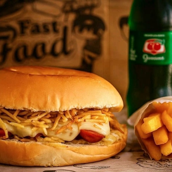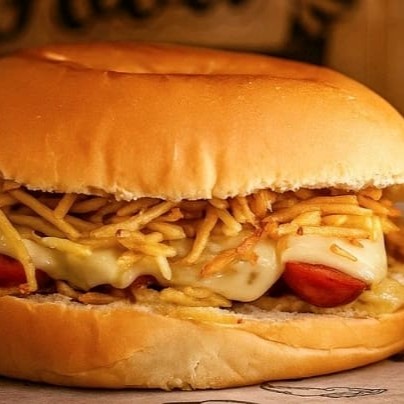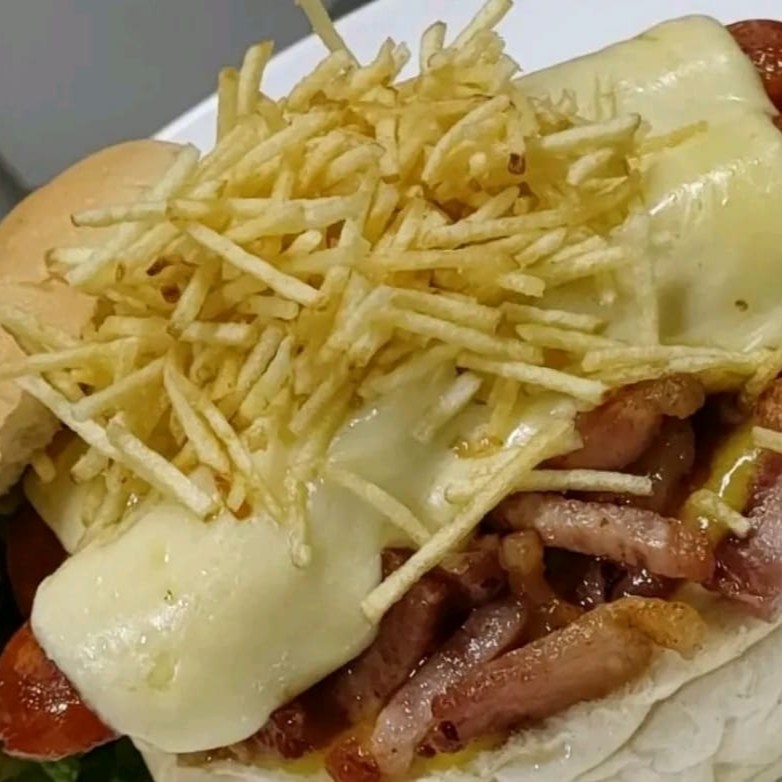 Pão, maionese, 2 salsichas, mussarela, cheddar, bacon e batata palha