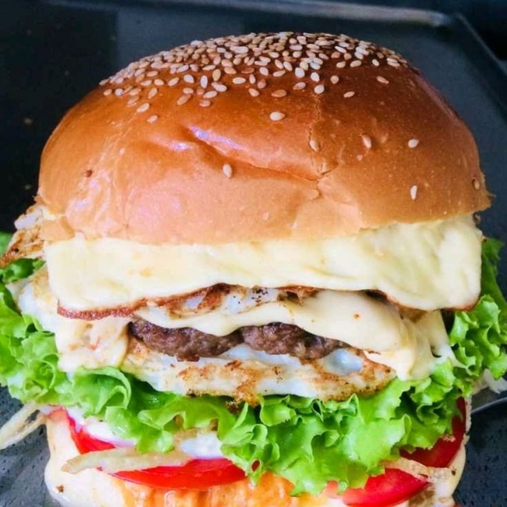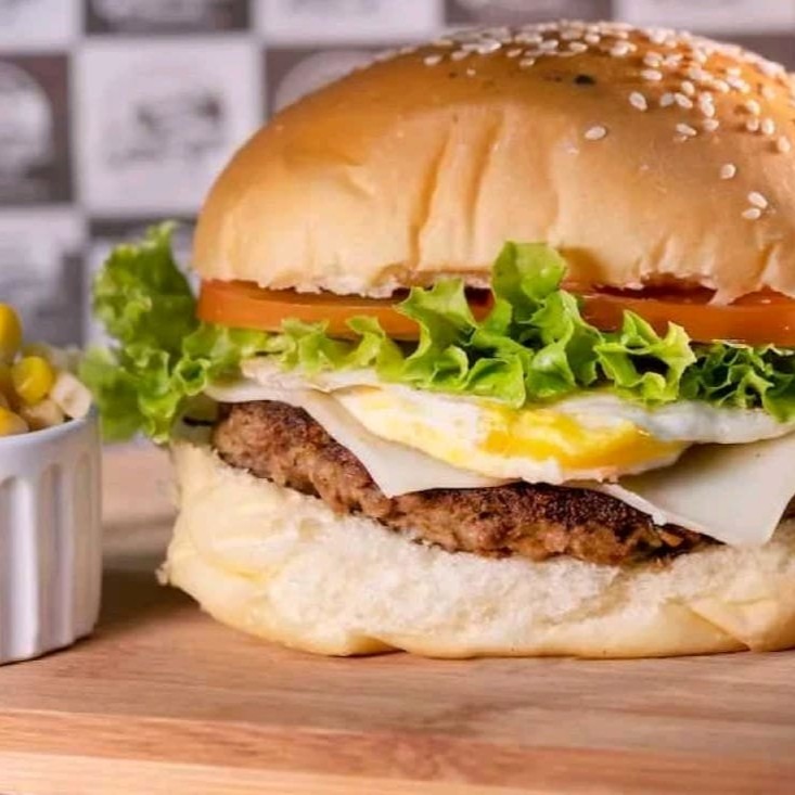 Pão, maionese, hambúrguer 90g, mussarela, ovo, alface e tomate