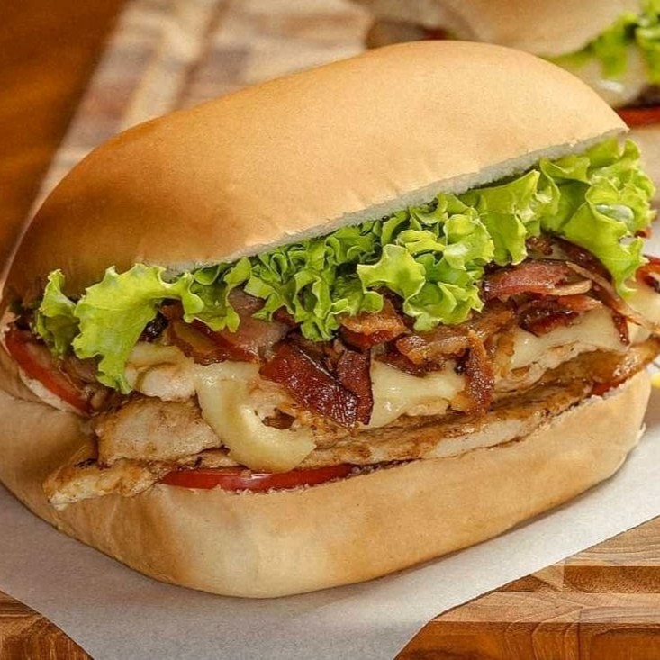 Pão, maionese, hambúrguer de frango 90g, mussarela, bacon, alface e tomae