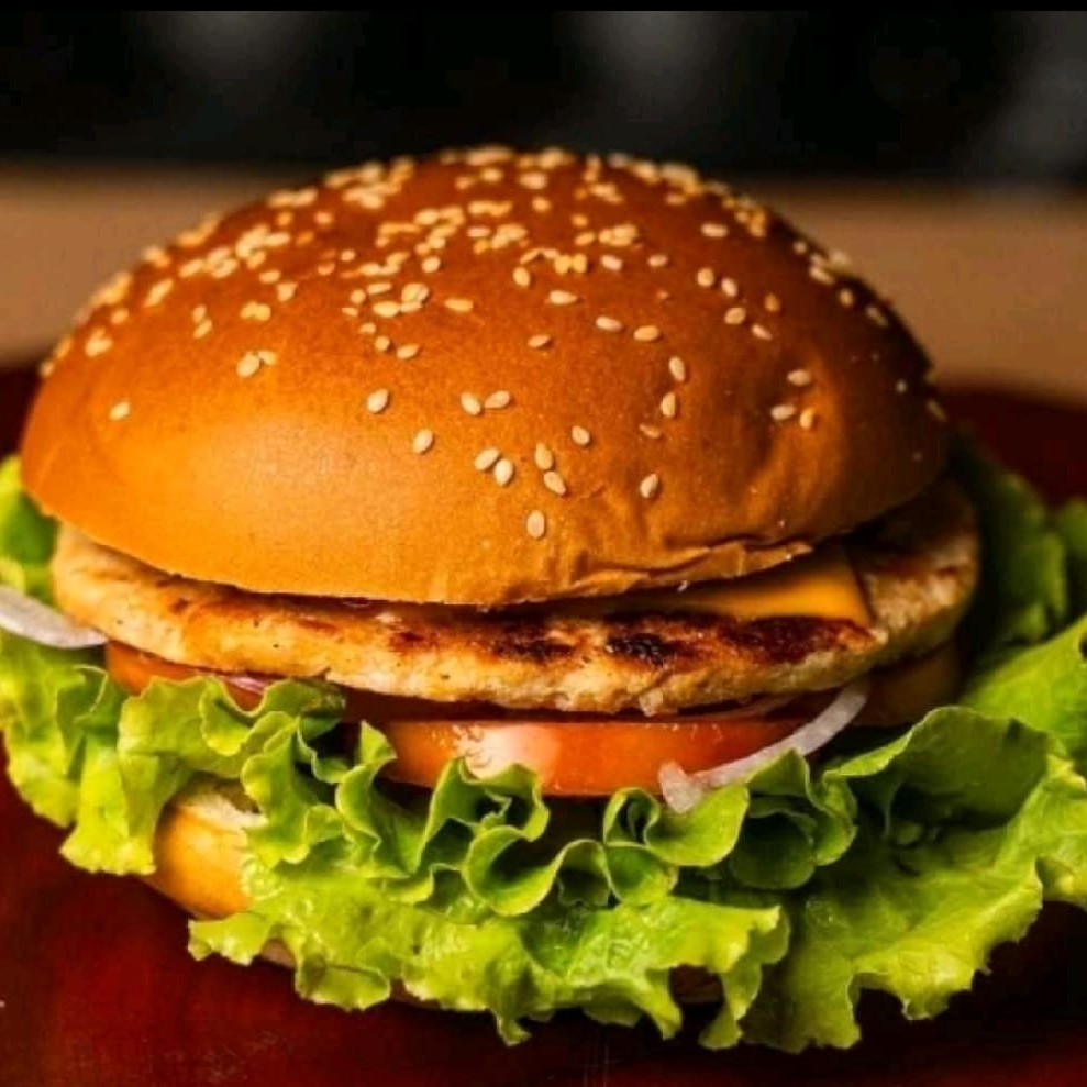 Pão, maionese, hambúrguer de frango 90g, mussarela, alface e tomate