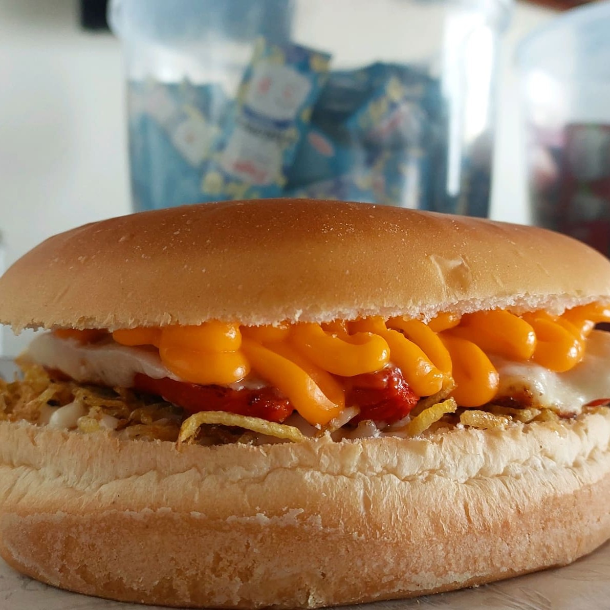 Pão, 2 salsichas, mussarela, cheddar e batata palha