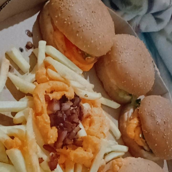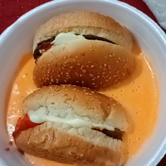 Pao cortado no meio , hambúrguer cheddar no pao , cheddar na marmita , batata frita