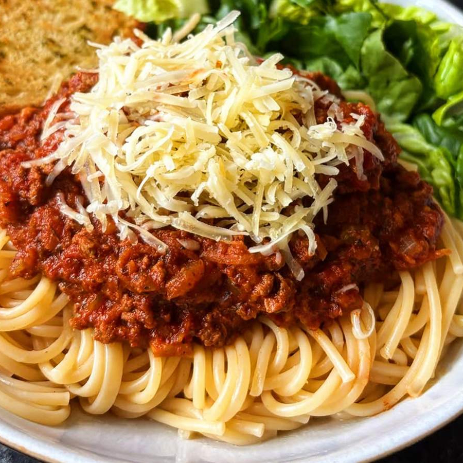 Macarrão esparguete, molho de tomate, shoyo, muçarela e calabresa