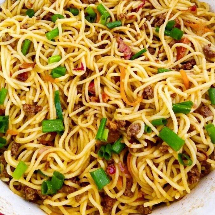 Macarrão de esparguete, bacon , muçarela, molho shoyo molho de tomate